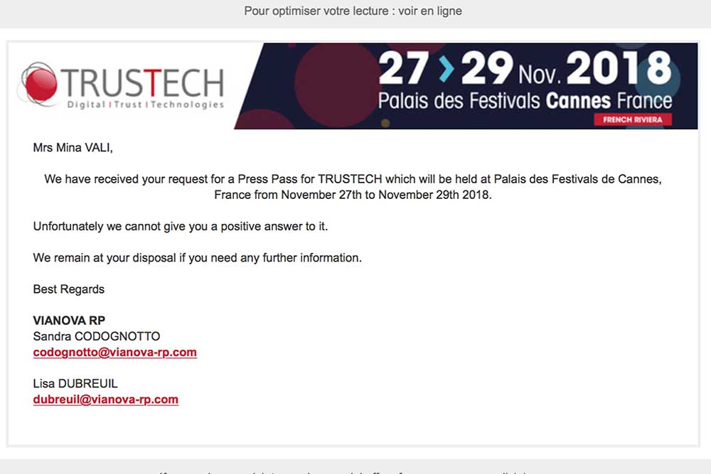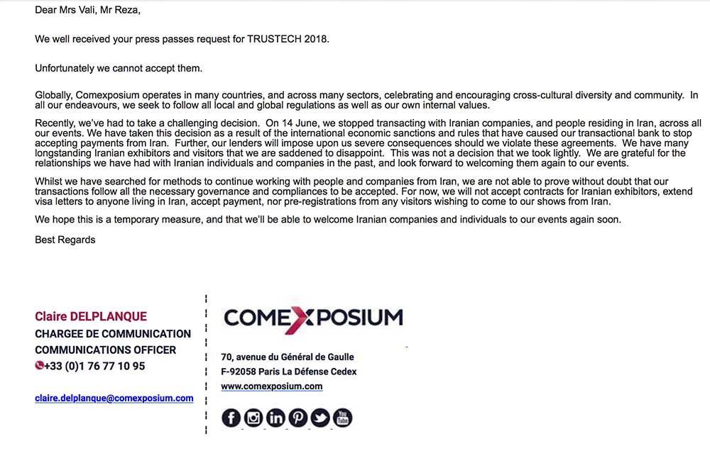 طی مکاتباتی که از هفتههای قبل با برگزارکنندگان رویداد داشتیم آنها اعلام کردند علی رغم میل باطنی نمیتوانند پذیرای ایرانیها در تراستک باشند. برای این منظور از چند هفته پیش به عنوان خبرنگار در رویداد تراستک فرانسه ثبتنام کرده بودیم که بعد از حدود ۲۰ روز گروه کمکسپوزیم، برگزارکننده این رویداد در دو ایمیل جدا اعلام کرد با درخواست ما موافقت نشده است. در ایمیل اول فقط اعلام شد که درخواست ما رد شده است. در ایمیلی دیگر کِلر دلپلانک، مدیر ارتباطات کمکسپوزیوم درباره علت رد شدن درخواست ما توضیح داد و گفت که «ما بهتازگی مجبور به گرفتن تصمیمات چالشبرانگیزی شدیم. از ۱۴ ژوئن تعاملات خودمان را با شرکتهای ایرانی و افرادی که در ایران زندگی میکنند، در تمام رویدادهایمان، متوقف کردیم. این تصمیم به دلیل تحریمهای اقتصادی بینالمللی اتخاذ شده است.»