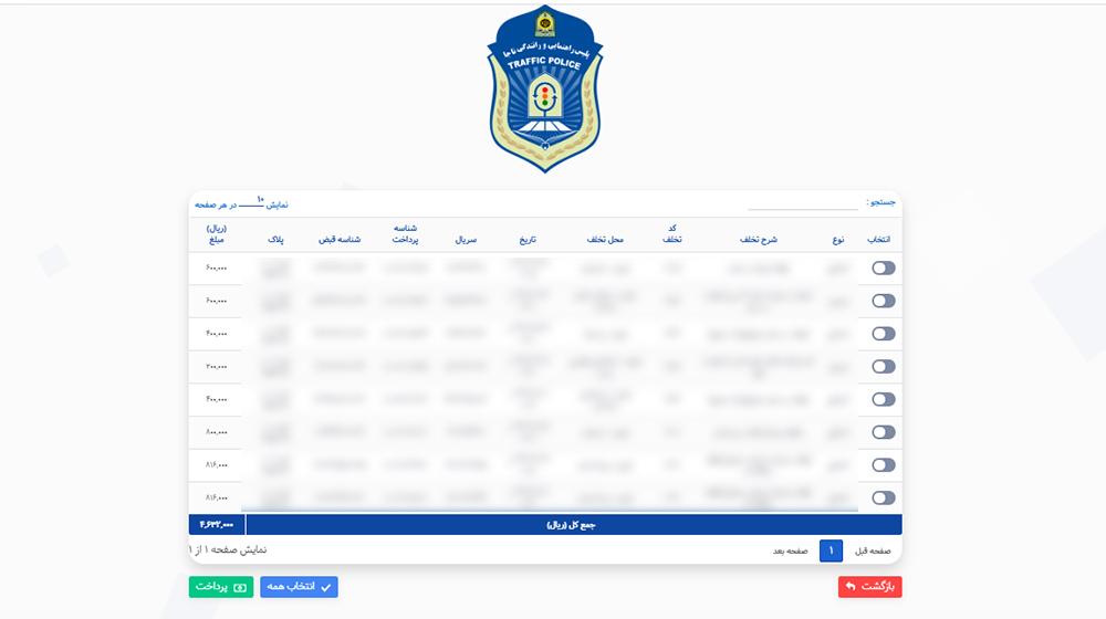 3. تمام تخلفات انجام شده نمایش داده می‌شود. با انتخاب تخلف مورد نظر گزینه پرداخت را انتخاب کنید.