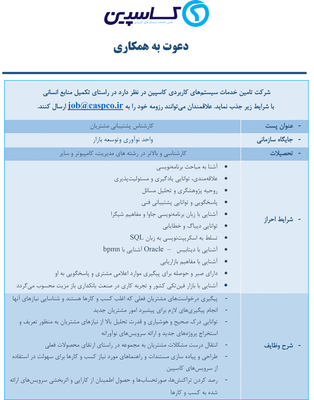 علاقهمندان میتوانند رزومه خود را به job@caspco.ir ارسال کنند.