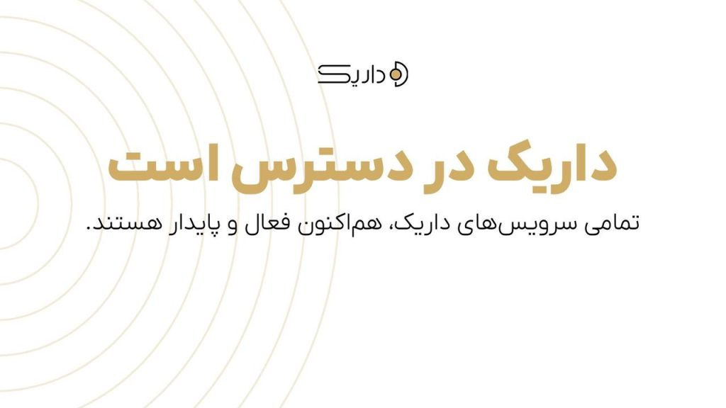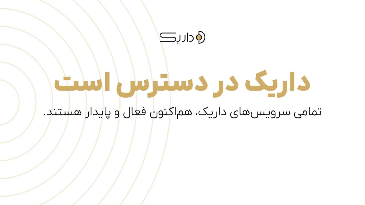 در پی قطعی موقت سرویسهای پلتفرم داریک، روابط عمومی داریک طی بیانیهای اعلام کرد: «با تلاش و پیگیری مداوم تیم فنی داریک و انجام بهینهسازیهای زیرساختی، مشکل فنی اخیر به طور کامل برطرف شد و تمامی سرویسها اکنون در دسترس، فعال و پایدار هستند. در تمام مدت، دارایی طلای شما به صورت امن در انبار داریک در بانک کارگشایی نگهداری شد و جای نگرانی وجود نداشت.»