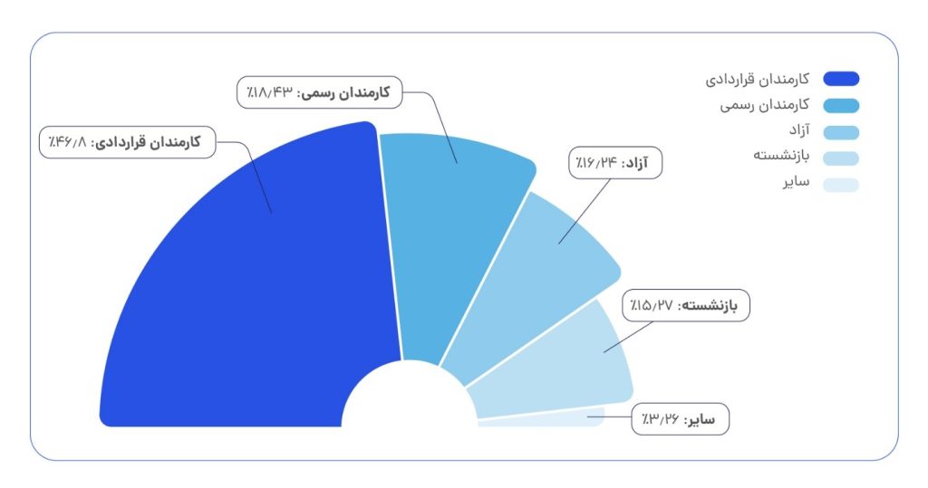 کارمندان بیشترین سهم دریافت وام از دیجی‌شهر را به‌خود اختصاص داده‌اند؛ به‌گونه‌ای که ۴۶.۸ درصد از وام‌ها مربوط به کارمندان قراردادی و ۱۸.۴۳ درصد به کارمندان رسمی بوده است. در مقابل، سهم مشاغل آزاد با ۱۶.۲۴ درصد، بازنشستگان با ۱۵.۲۷ درصد و سایر گروه‌های شغلی با ۳.۲۶ درصد سهم کمتری در این بخش داشته‌اند. این آمار نشان می‌دهد که کارمندان به‌دلیل درآمد ثابت و قدرت بازپرداخت، بیشترین تقاضا برای استفاده از خدمات اعتباری دیجی‌شهر را دارند.