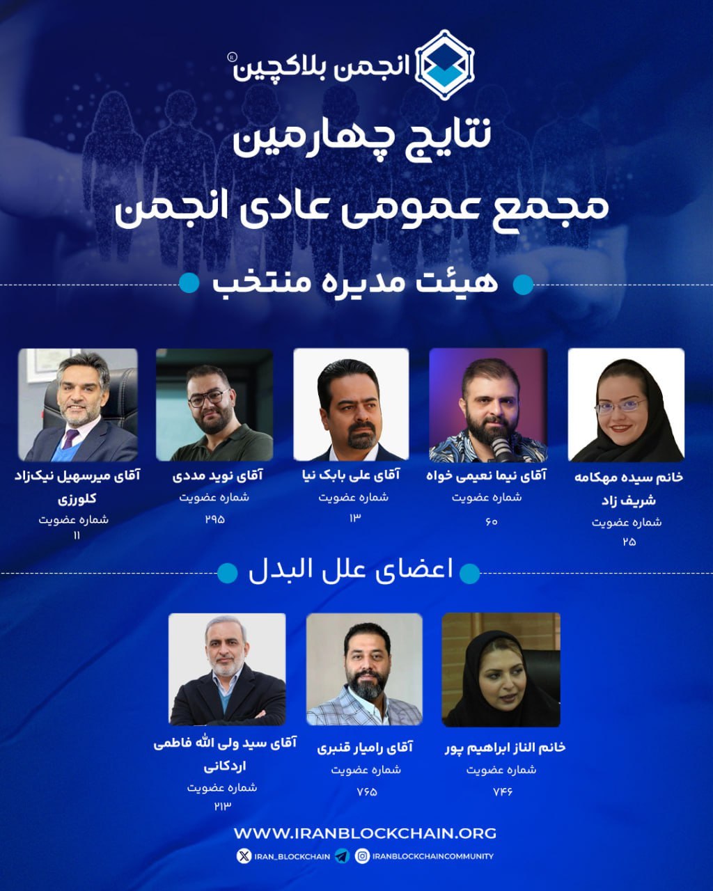 چهارمین مجمع عمومی انجمن بلاکچین در تاریخ ۲۴ مهر ۱۴۰۴ از ساعت ۱۰ صبح تا ۱۴:۴۵ برگزار شد. در این نشست، اعضای انجمن پس از استماع گزارش رئیس هیئتمدیره و مدیرعامل پیشین، رأیگیری برای انتخاب اعضای جدید هیئتمدیره و بازرس را انجام دادند.