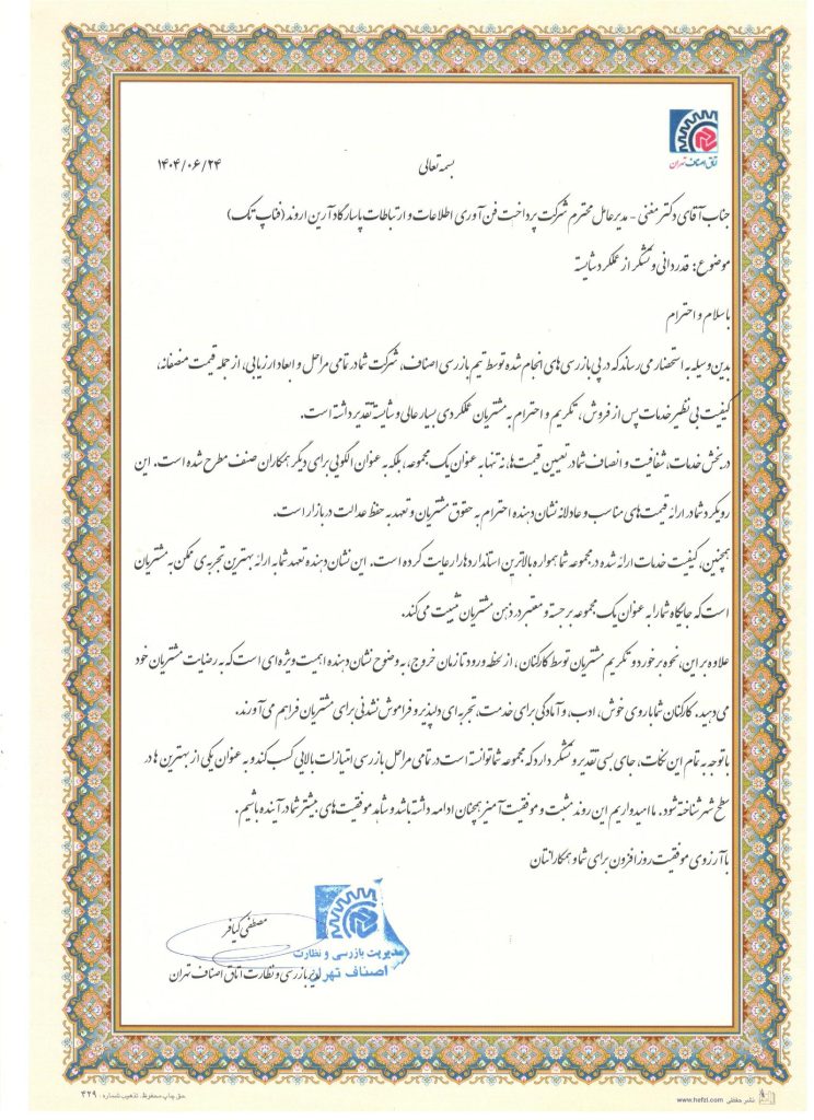تقدیر اتاق اصناف تهران از فناپ تک به دلیل قیمت‌گذاری عادلانه محصولات و کیفیت خدمات پس از فروش