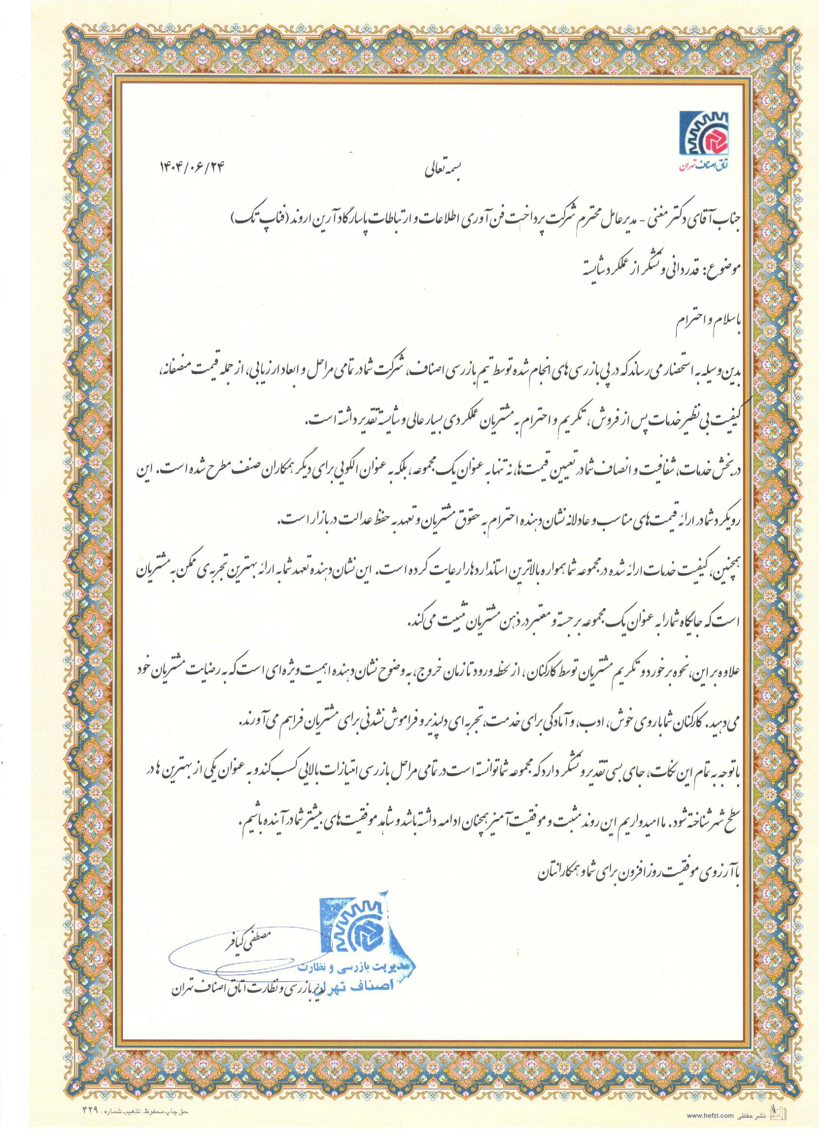 تقدیر اتاق اصناف تهران از فناپ تک به دلیل قیمت‌گذاری عادلانه محصولات و کیفیت خدمات پس از فروش