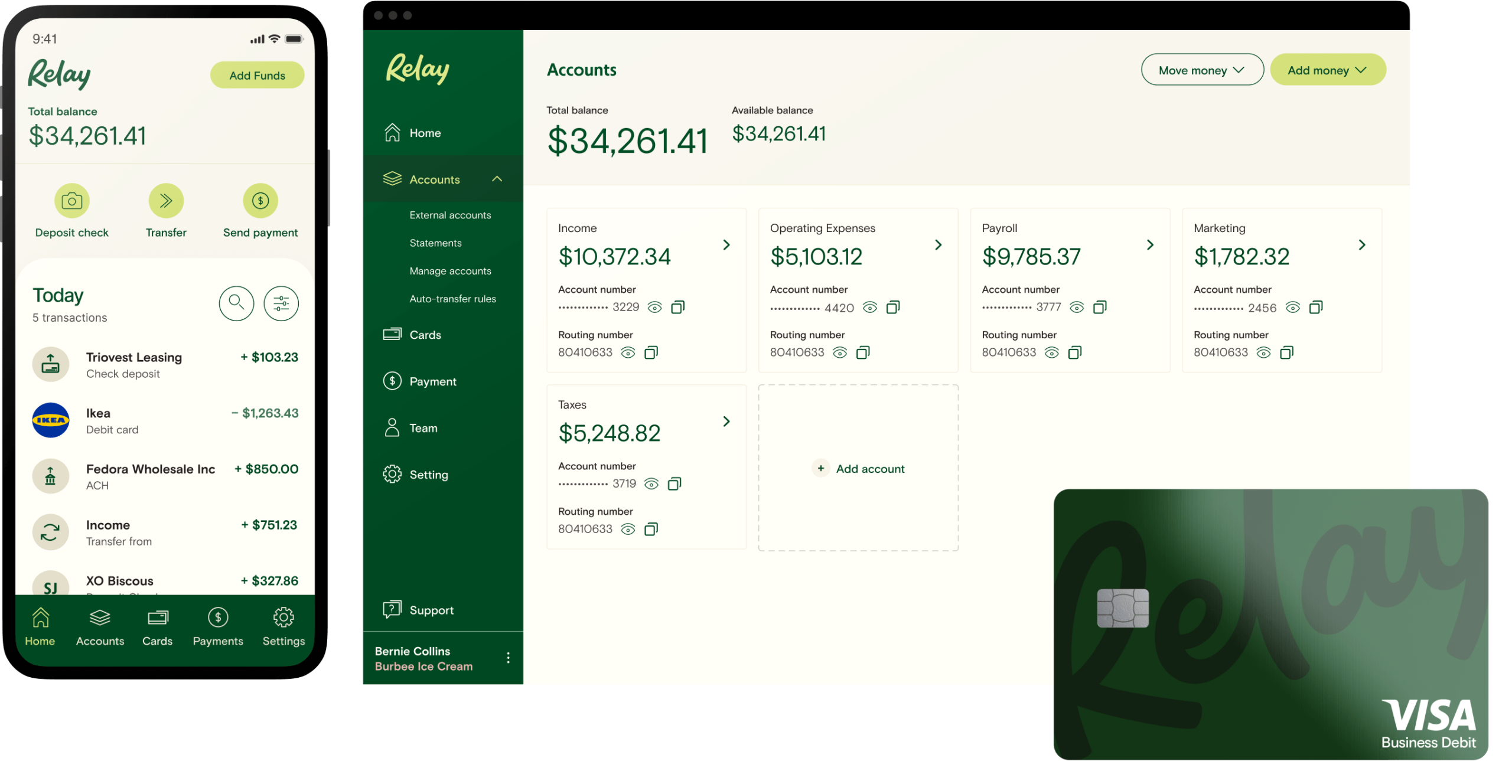 Relay بانکداری آنلاین بدون کارمزد برای کسبوکارهای کوچک آمریکایی ارائه میدهد. کاربران میتوانند تا ۲۰ حساب جاری و دو حساب پسانداز با نرخ سود ۱.۷۵ تا ۳.۷۶ درصد باز کنند و با ابزارهای هوشمند مدیریت نقدینگی، انتقال خودکار وجوه و کارت ویزا با ۱.۵ درصد بازگشت نقدی از آن استفاده کنند. این پلتفرم با نرمافزارهای حسابداری مانند QuickBooks و Xero یکپارچه است.