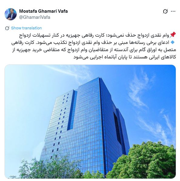 همچنین مصطفی قمریوفا در صفحه شخصی خود در شبکه اجتماعی ایکس (X) نوشت: «ادعای برخی رسانهها مبنی بر حذف وام نقدی ازدواج تکذیب میشود. کارت رفاهی متصل به اوراق گام برای آندسته از متقاضیان وام ازدواج که متقاضی خرید جهیزیه از کالاهای ایرانی هستند تا پایان آبانماه اجرایی میشود.»