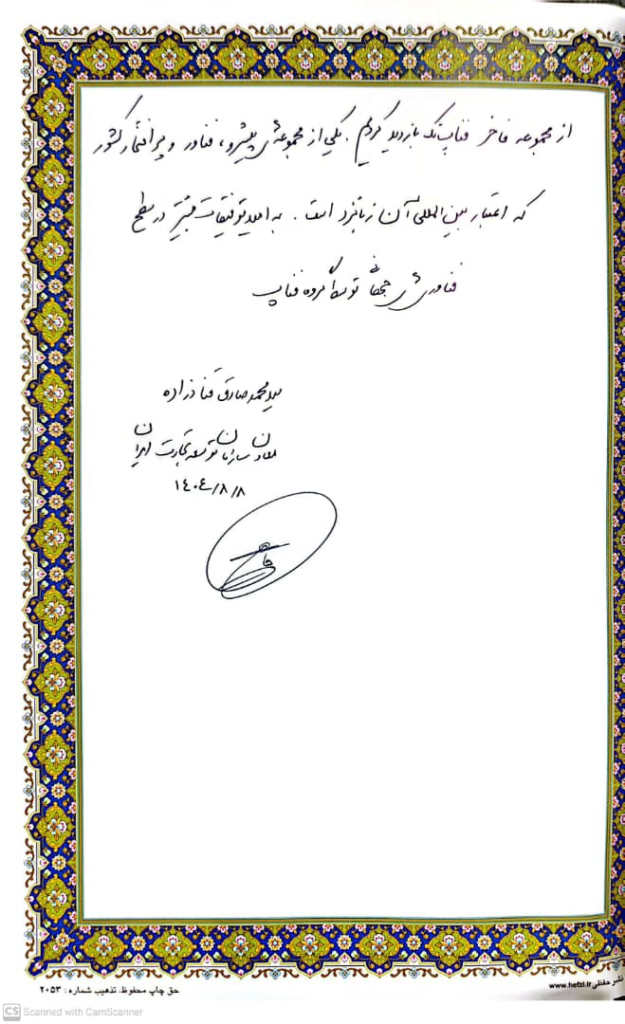قنادزاده، ضمن قدردانی از تلاشهای مدیران و کارکنان فناپتک، در دفتر یادبود شرکت نوشت: «از مجموعه فاخر فناپتک بازدید کردیم؛ یکی از مجموعههای پیشرو، فناور و پرافتخار کشور که اعتبار بینالمللی آن زبانزد است. به امید توفیقات بیشتر در سطح فناوریهای جهانی توسط گروه فناپ.»