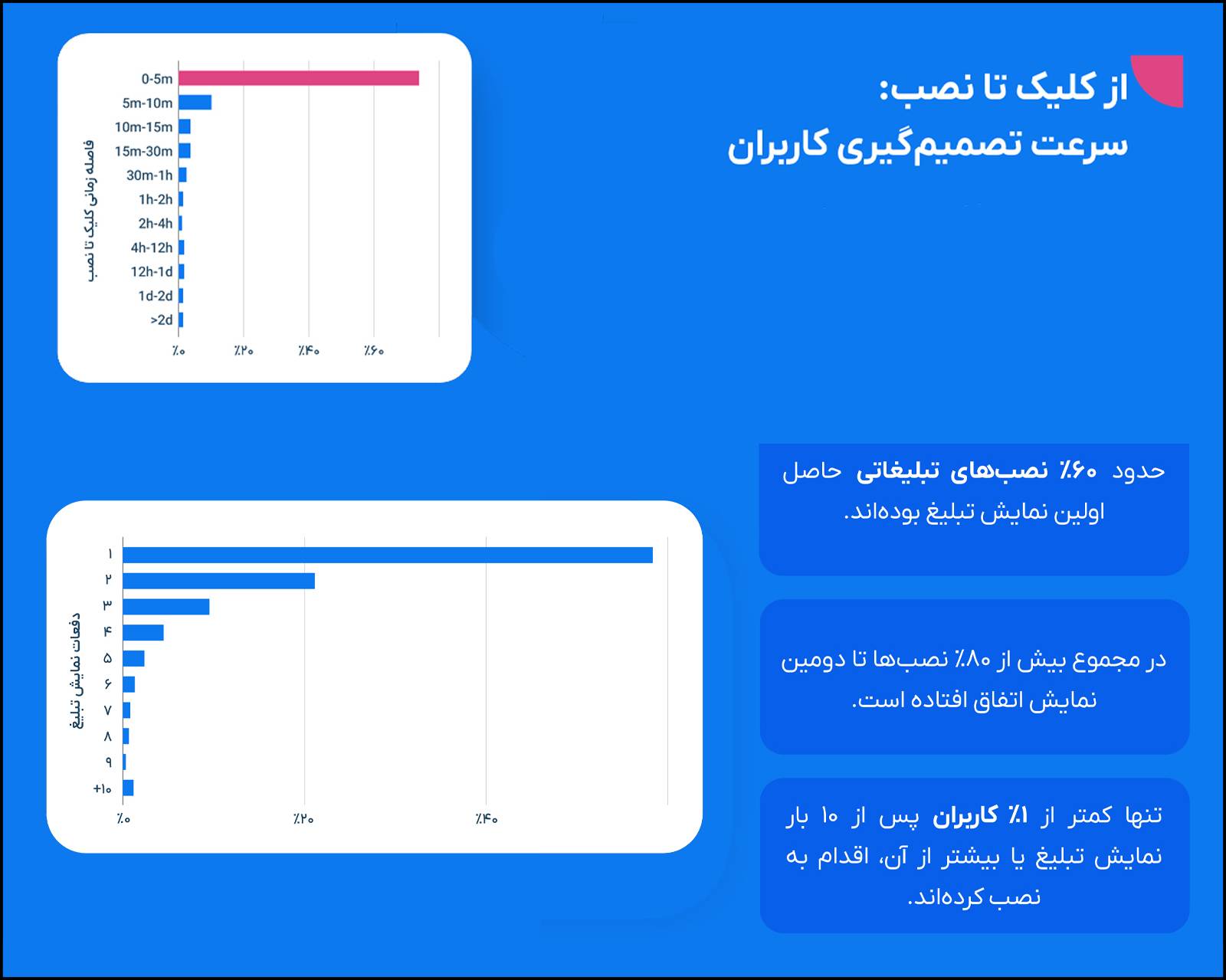 در سال ۱۴۰۳، نصب‌های تبلیغاتی در مایکت نشان داد که کاربران در بیشتر موارد به سرعت پس از کلیک روی تبلیغ اقدام به نصب می‌کنند. حدود ۷۵ درصد نصب‌ها در کمتر از ۵ دقیقه پس از کلیک انجام شد و بیش از ۹۳ درصد نصب‌ها حداکثر تا یک ساعت پس از کلیک ثبت شده‌اند، در حالی که کمتر از یک درصد کاربران نصب را به بیش از دو روز بعد موکول کرده‌اند. تحلیل روند تکرار نمایش تبلیغ نیز نشان می‌دهد که حدود ۶۰ درصد نصب‌ها از اولین نمایش تبلیغ و بیش از ۸۰ درصد نصب‌ها تا دومین نمایش اتفاق افتاده است. کمتر از یک درصد کاربران پس از ده بار نمایش یا بیشتر اقدام به نصب کرده‌اند.
