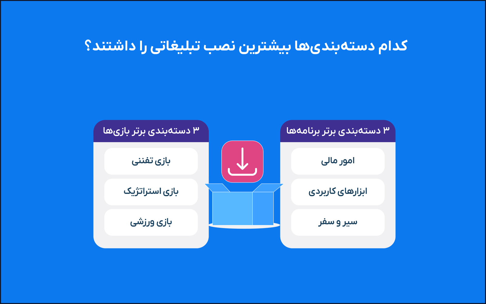 بررسی داده‌های سال ۱۴۰۳ نشان می‌دهد برخی دسته‌بندی‌ها بیشترین بهره را از تبلیغات مایکت برده و بالاترین تعداد نصب تبلیغاتی را ثبت کرده‌اند. در میان برنامه‌ها، امور مالی، ابزارهای کاربردی و سیر و سفر بیشترین نصب تبلیغاتی را داشتند و در بخش بازی‌ها، بازی تفننی، بازی استراتژیک و بازی ورزشی پیشتاز بودند.