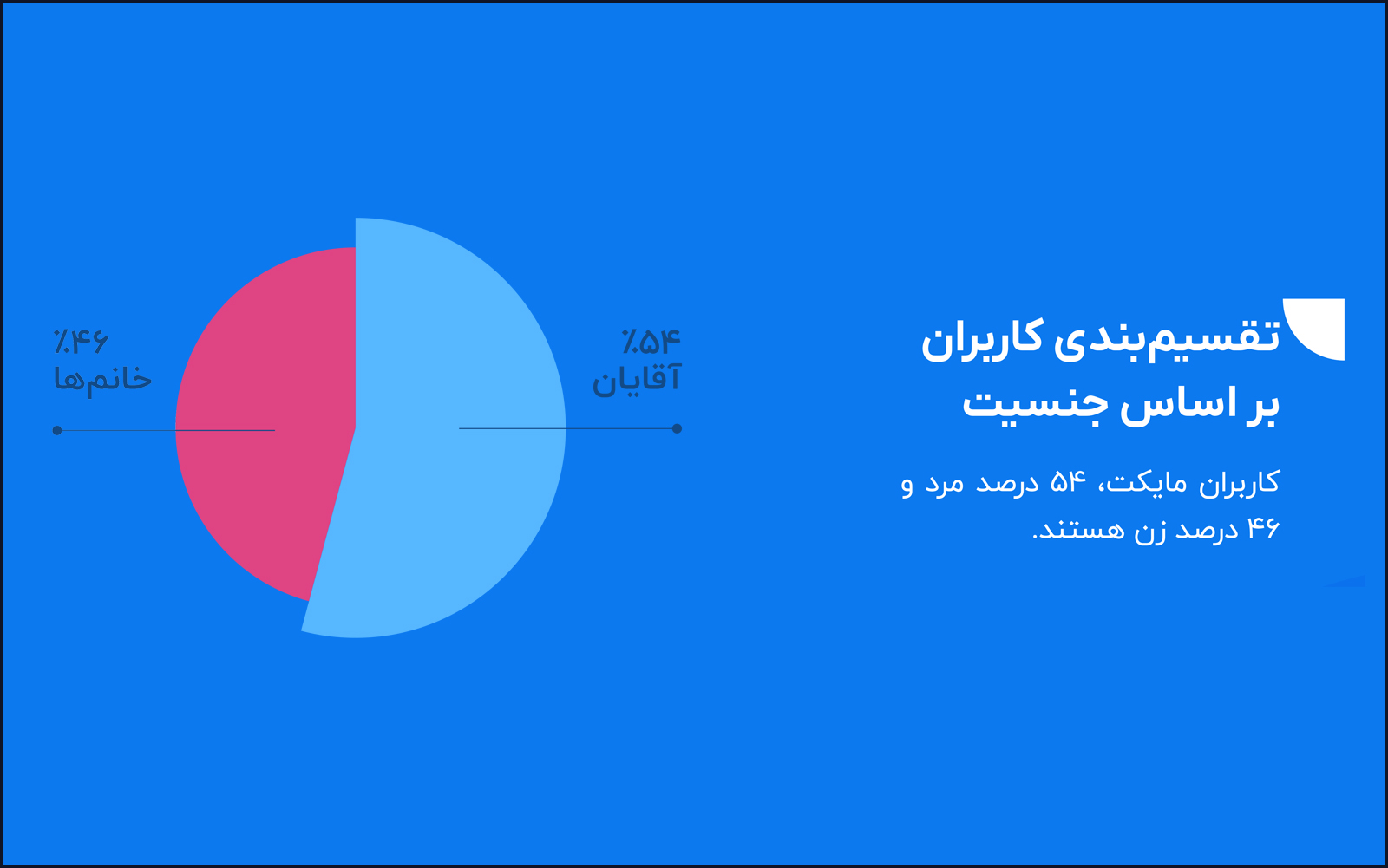 در سال ۱۴۰۳، بررسی داده‌های کاربران مایکت نشان می‌دهد که ۵۴ درصد از کاربران مرد و ۴۶ درصد زن بوده‌اند.