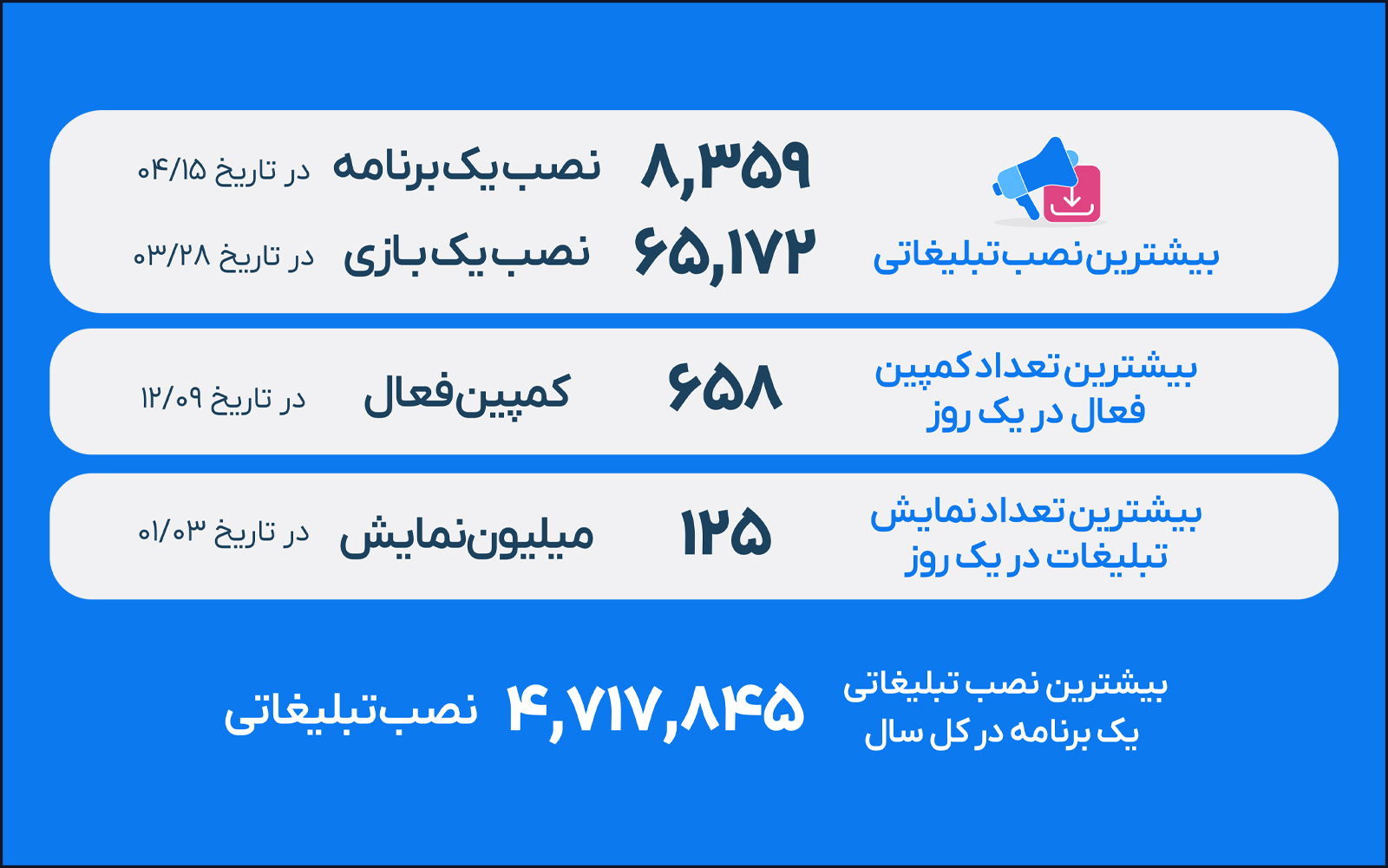 در سال گذشته، برخی از اپلیکیشن‌ها و بازی‌ها رکوردهای جدیدی ثبت کردند؛ بیشترین نصب تبلیغاتی برای یک برنامه ۸,۳۵۹ نصب در تاریخ ۰۴/۱۵ و بیشترین نصب یک بازی ۶۵,۱۷۲ نصب در تاریخ ۰۳/۲۸ بود. همچنین بیشترین تعداد کمپین فعال در یک روز ۶۵۸ کمپین و بیشترین تعداد نمایش تبلیغ در یک روز ۱۲۵ میلیون نمایش بود. در کل سال، بیشترین نصب تبلیغاتی برای یک برنامه به ۴,۷۱۷,۸۴۵ نصب رسید.