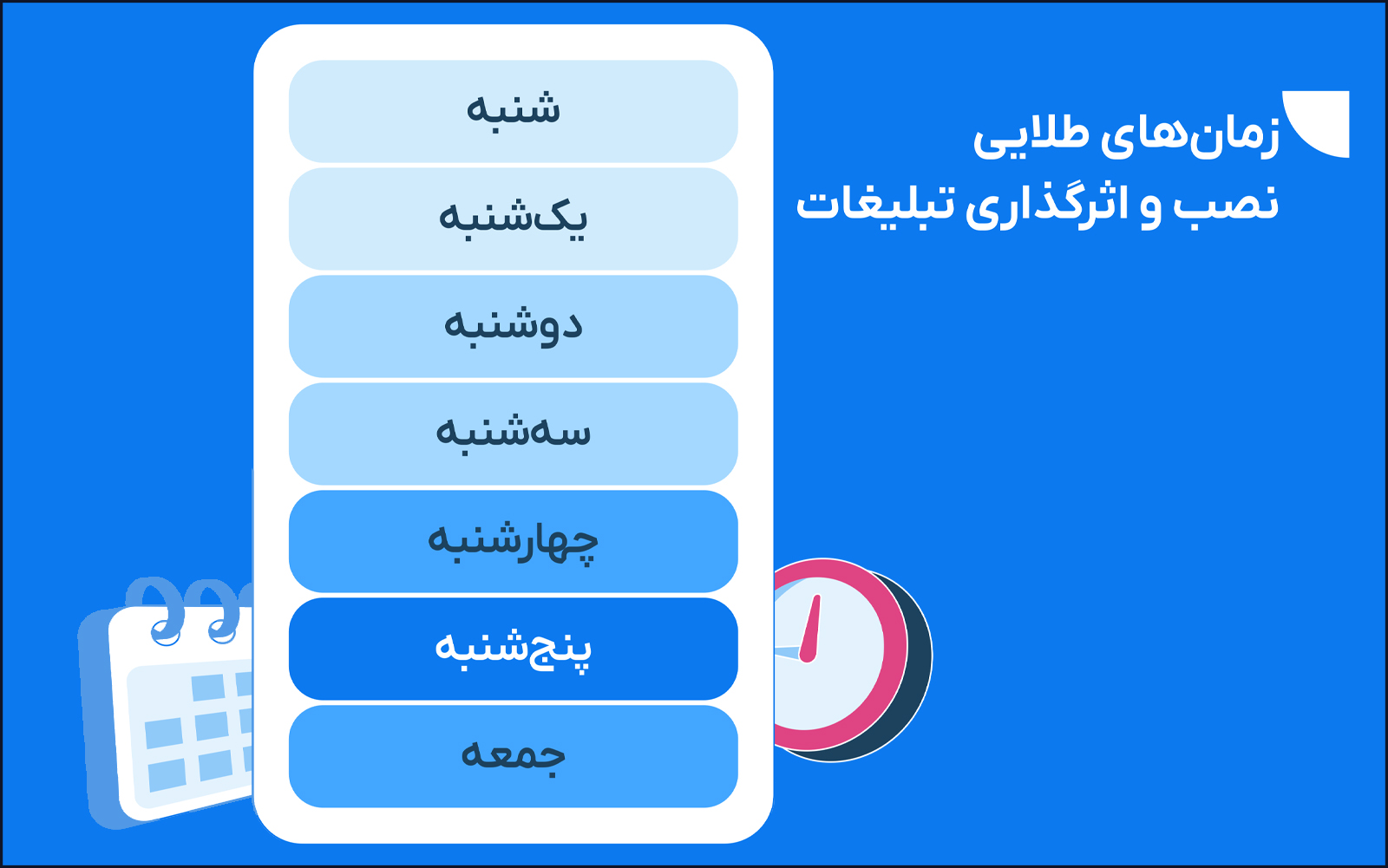 روزهای چهارشنبه، پنج‌شنبه و جمعه بیشترین نصب تبلیغاتی را داشتند و شنبه کمترین میزان نصب ثبت شد. نرخ تبدیل نصب نیز در چهار بازه زمانی ۹ صبح، ۱۲ ظهر، ۶ عصر و ۱۱ شب نسبت به ساعات قبل و بعد، بالاتر بود و این زمان‌ها به عنوان بازه‌های طلایی اثرگذاری تبلیغات شناسایی شدند.