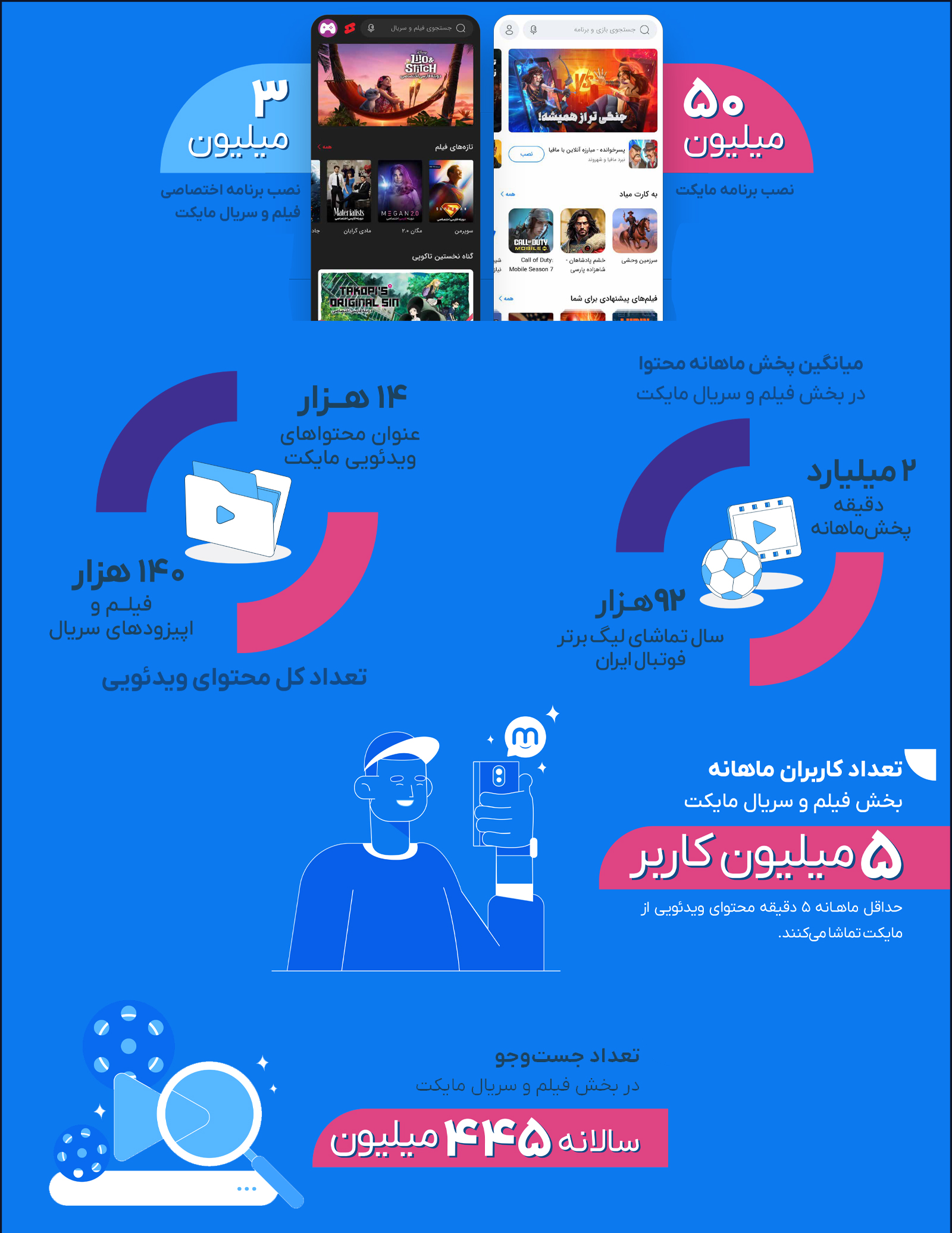 از نظر نصب برنامه مایکت در میان خانواده‌ها، به طور متوسط دو نفر در هر خانواده مایکت را نصب کرده‌اند، با مجموع ۵۰ میلیون نصب برنامه مایکت و ۳ میلیون نصب برنامه اختصاصی فیلم و سریال. در بخش فیلم و سریال، میانگین پخش ماهانه محتوا ۲ میلیارد دقیقه بوده و کاربران حداقل ماهانه ۵ میلیون نفر با حداقل ۵ دقیقه مشاهده داشته‌اند. تعداد جست‌وجو در این بخش نیز سالانه به ۴,۴۴۵ میلیون جست‌وجو رسید. مجموع محتوای ویدئویی مایکت در سال ۱۴۰۳ شامل ۱۴ هزار عنوان و ۱۴۰ هزار فیلم و اپیزود سریال بود، که نشان‌دهنده تنوع گسترده محتوا برای کاربران است.