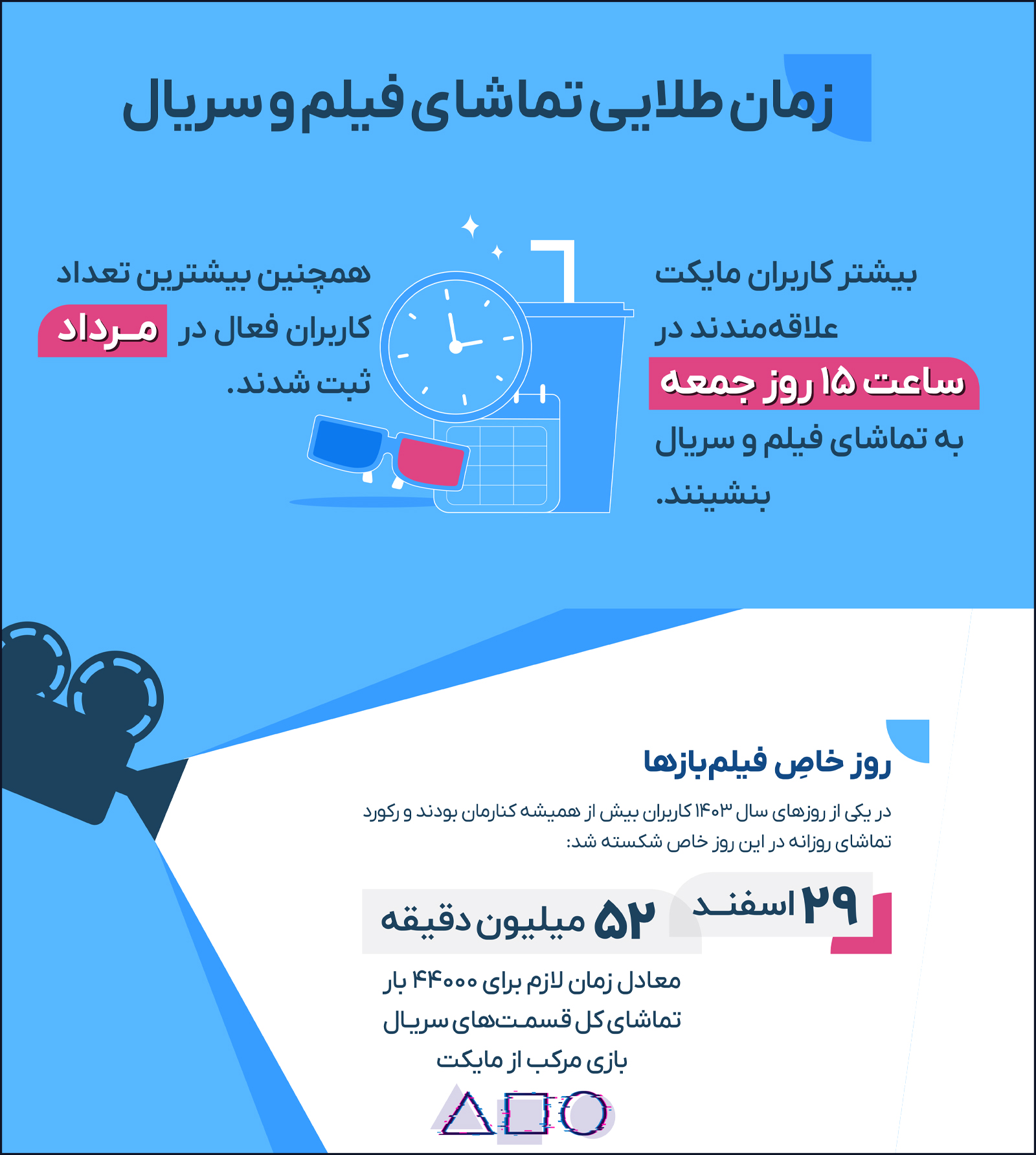 تحلیل داده‌های سال ۱۴۰۳ نشان می‌دهد کاربران مایکت بیشترین علاقه را به تماشای فیلم و سریال در ساعت ۱۵ روز جمعه دارند و همچنین بیشترین تعداد کاربران فعال در این بخش در ماه مرداد ثبت شده است. در یکی از روزهای سال، ۲۹ اسفند، رکورد تماشای روزانه شکسته شد؛ کاربران در این روز ۵۲ میلیون دقیقه محتوا مشاهده کردند که معادل زمان لازم برای ۴۴ هزار بار تماشای کل قسمت‌های سریال بازی مرکب است.