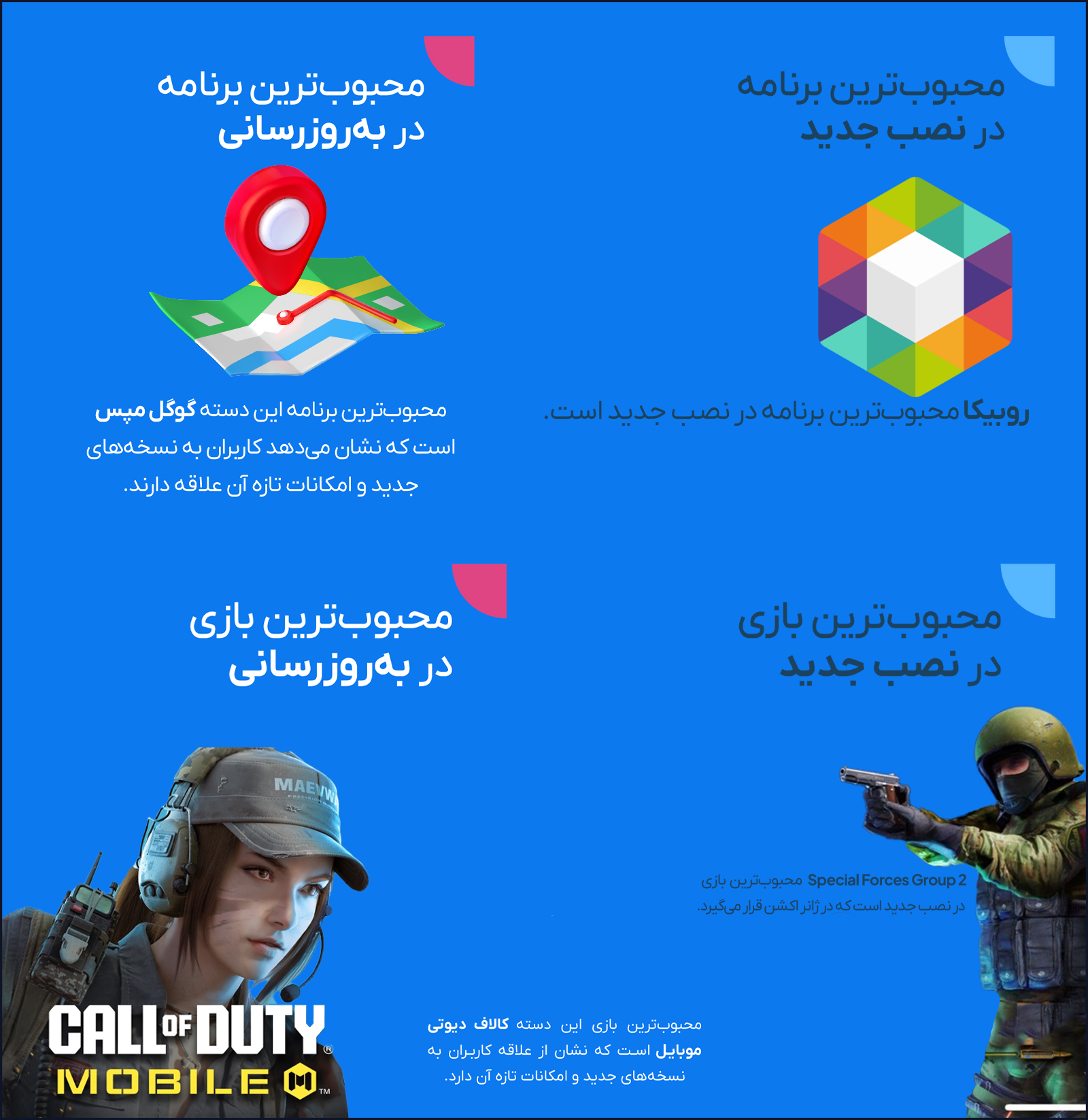 در میان هزاران برنامه و بازی که هر روز توسط کاربران نصب و به‌روزرسانی می‌شوند، برخی اپلیکیشن‌ها توانسته‌اند بیشترین توجه را جلب کنند. در زمینه برنامه‌ها، روبیکا در نصب‌های جدید پیشتاز بود، و گوگل مپس نیز به دلیل انتشار نسخه‌های به‌روز و قابلیت‌های تازه، بیشترین میزان به‌روزرسانی را داشت. این ارقام نشان می‌دهد کاربران ایرانی همواره به دنبال امکانات جدید و بهبود تجربه کاربری هستند.