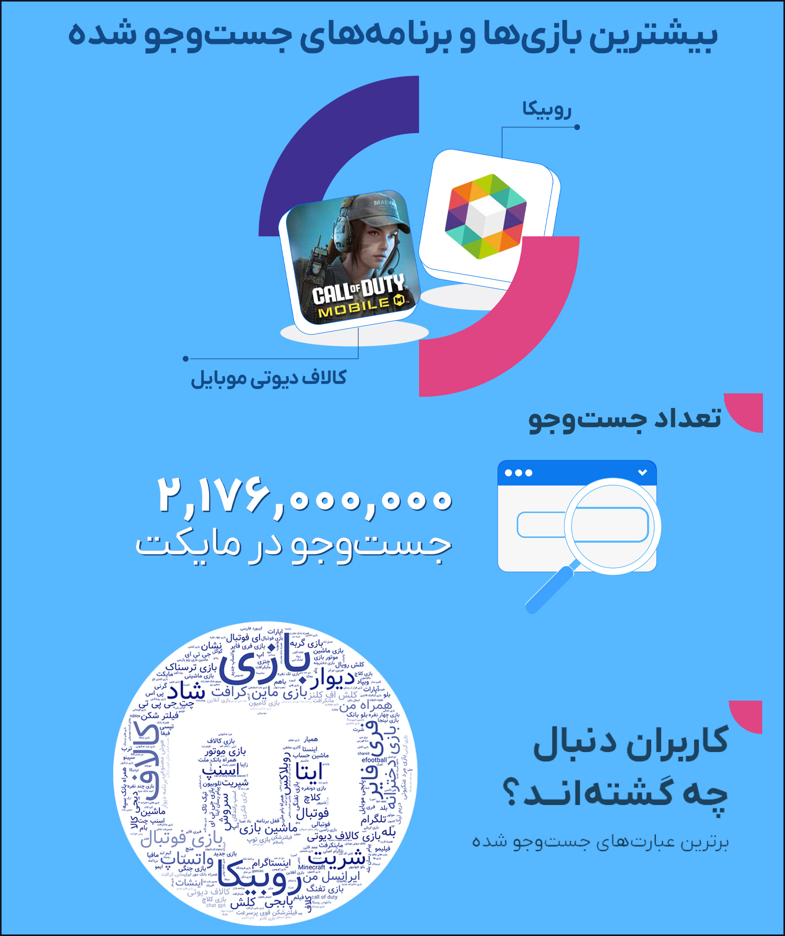 بررسی داده‌های سال ۱۴۰۳ نشان می‌دهد که برخی برنامه‌ها و بازی‌ها بیشترین سهم را از جست‌وجو در مایکت داشته‌اند. از میان برنامه‌ها، روبیکا بیشترین جست‌وجو را به خود اختصاص داد و در میان بازی‌ها، کالاف دیوتی موبایل پیشتاز بود.