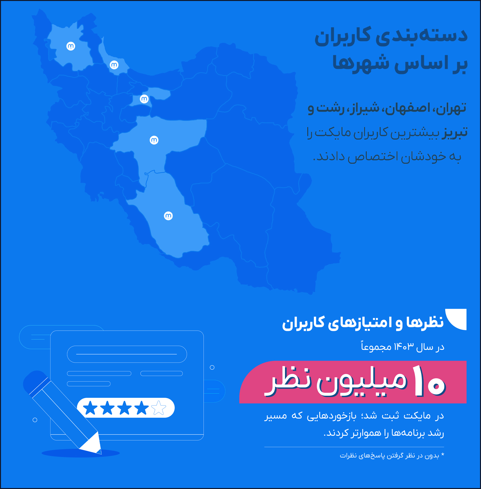 بیشترین کاربران مایکت در سال گذشته در تهران، اصفهان، شیراز، رشت و تبریز متمرکز بودند؛ شهری که بیشترین تراکم دیجیتال و مصرف برنامه را نشان می‌دهد. در همین مدت، کاربران بیش از ۱۰ میلیون نظر در مایکت ثبت کردند؛ بازخوردهایی که مسیر رشد برنامه‌ها و بهبود تجربه کاربری را هموارتر کرد.