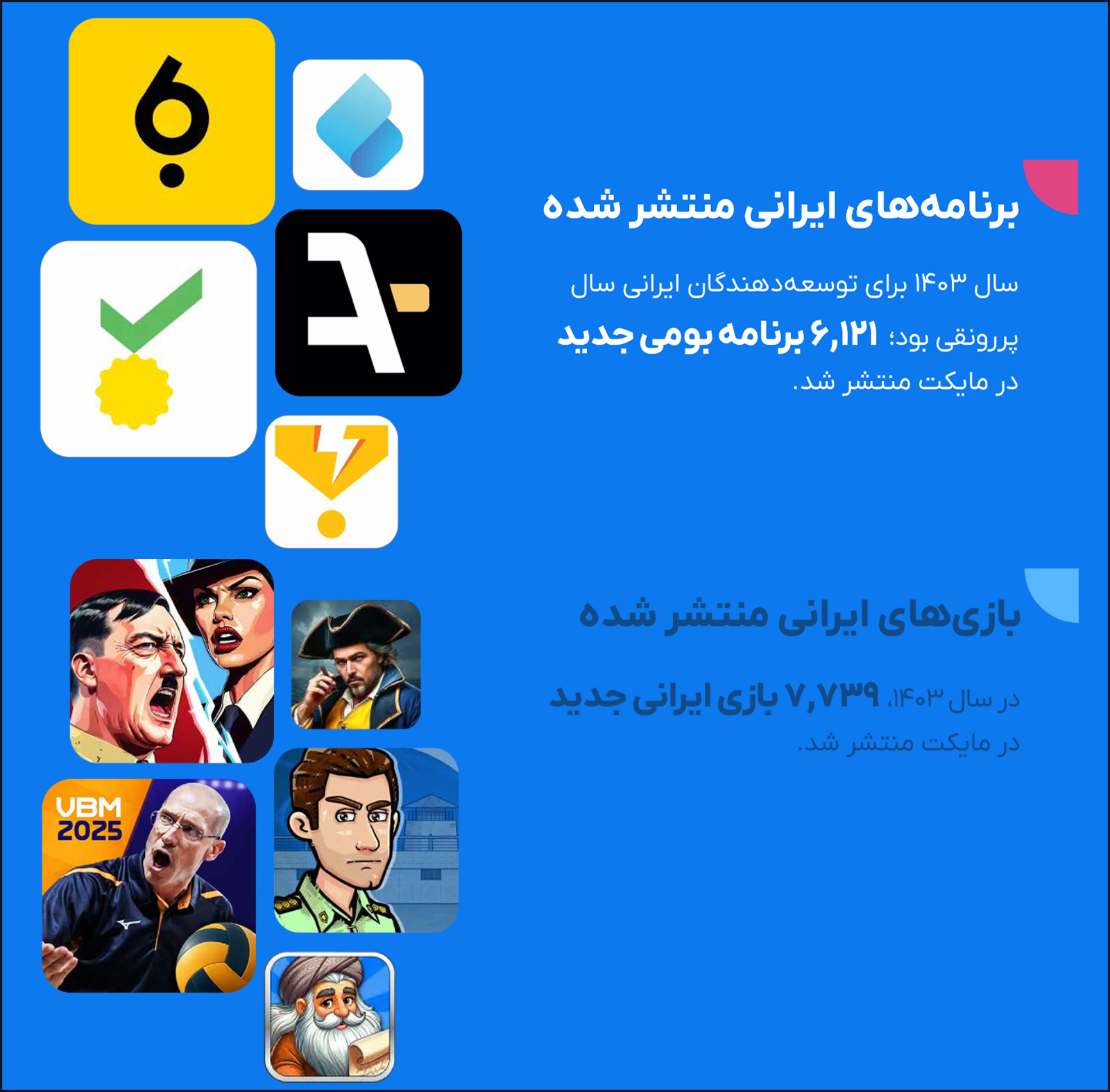 در سال ۱۴۰۳، ۷.۷۳۹ بازی ایرانی جدید و ۶.۱۲۱ برنامه بومی جدید در مایکت منتشر شد. این آمار، تعداد محصولات بومی منتشرشده و دسترسی کاربران به آن‌ها را نشان می‌دهد.