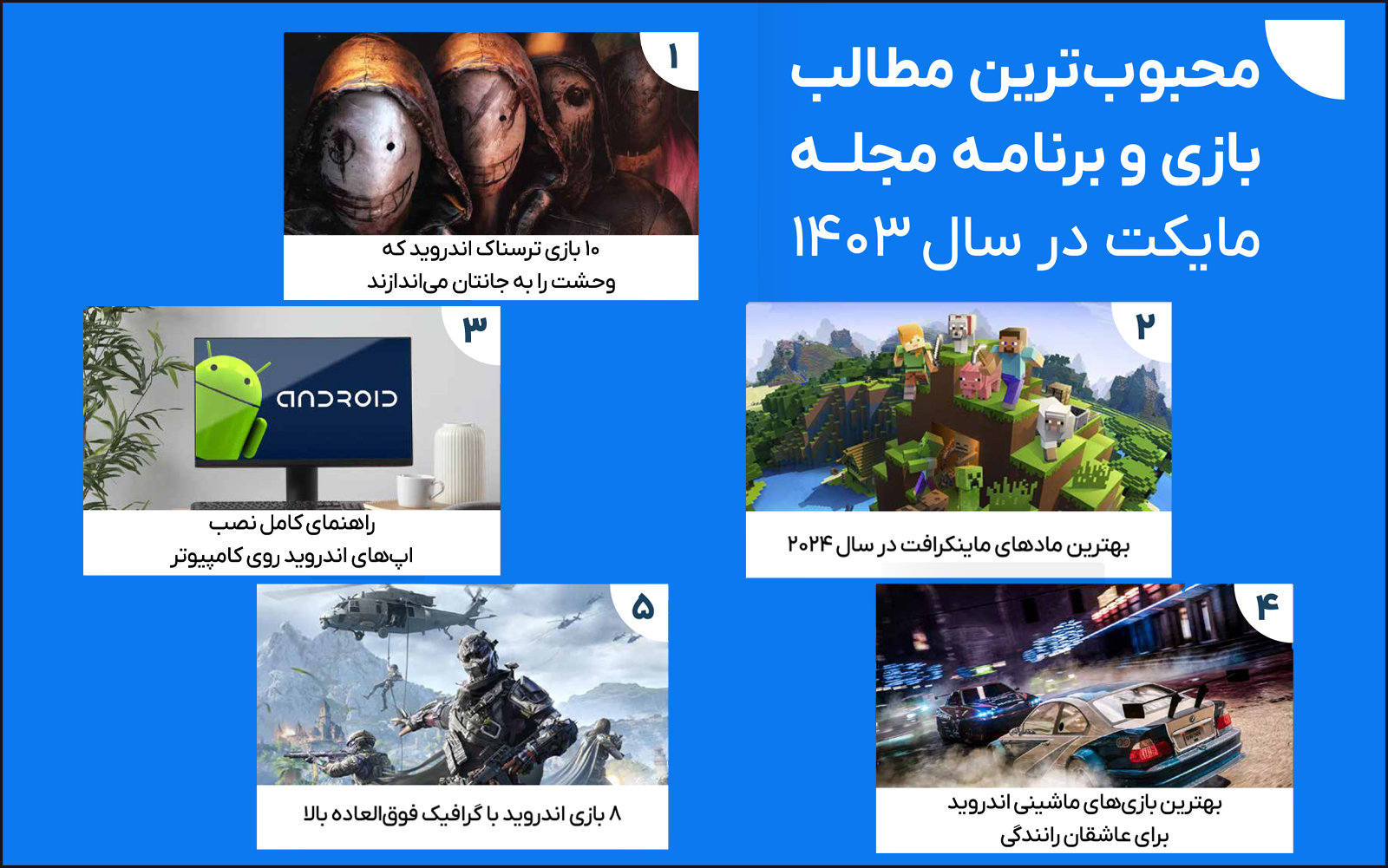 مطالب مجله مایکت که بیشترین بازدید را در سال ۱۴۰۳ داشتند شامل ۱۰ بازی ترسناک اندروید که وحشت را به جانتان می‌اندازند، بهترین مادهای ماینکرافت در سال ۲۰۲۴، راهنمای کامل نصب اپ‌های اندروید روی کامپیوتر، بهترین بازی‌های ماشینی اندروید باری عاشقان رانندگی و ۸ بازی اندروید با گرافیک فوق‌العاده بالا بودند.