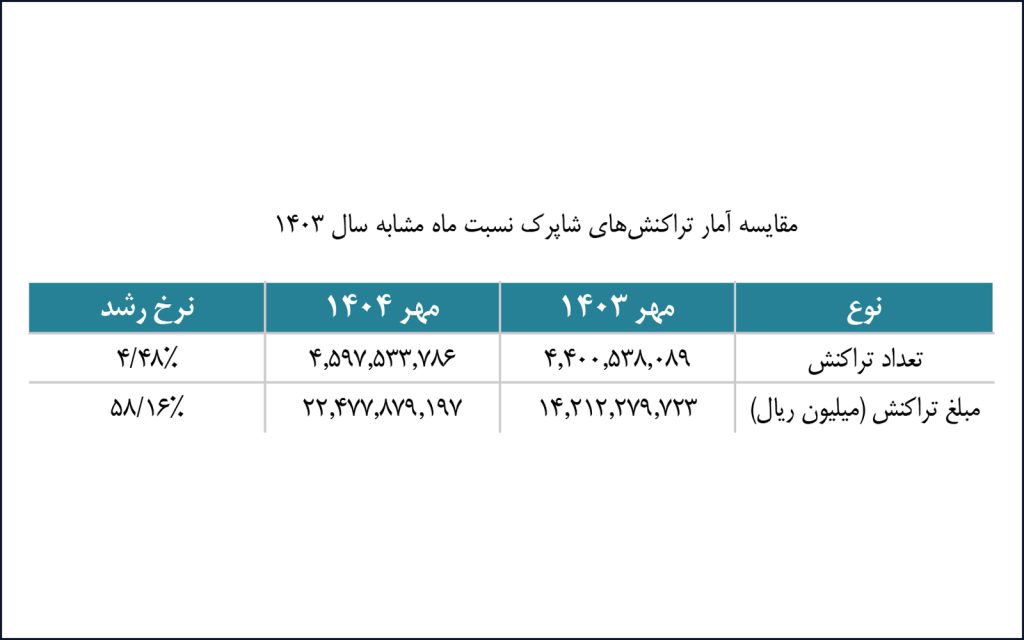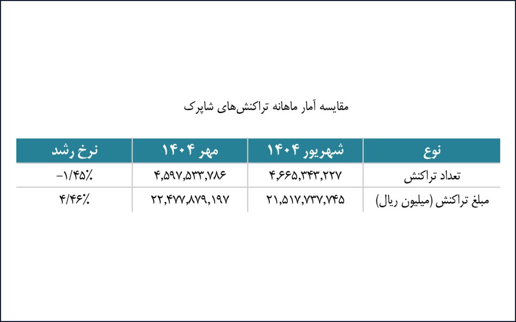 در مهرماه ۱۴۰۴ بیش از ۲۲.۴۷۷ هزار میلیارد ریال تراکنش در شبکه شاپرک پردازش شد که نسبت به شهریورماه کاهش ۱.۴۵ درصدی در تعداد و افزایش ۴.۴۶ درصدی در ارزش ریالی داشته است. در مقایسه با مهرماه ۱۴۰۳، تعداد تراکنشها ۴.۴۸ درصد و ارزش ریالی آنها ۵۸.۱۶ درصد رشد یافته است. در این ماه، شرکتهای «پرداخت الکترونیک سامان» و «به پرداخت ملت» به ترتیب در سهم تعدادی و مبلغی تراکنشها پیشتاز بودهاند و بانک ملت همچنان بالاترین سهم پذیرش تراکنشهای بازار را به خود اختصاص داده است.