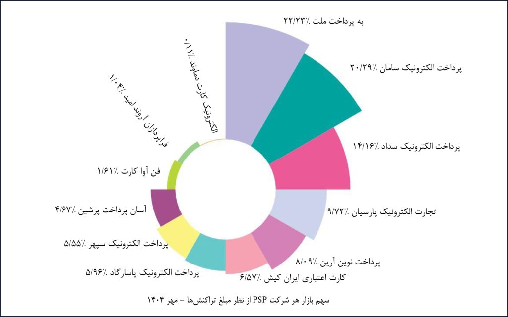 در شاخص سهم تعدادی و مبلغی تراکنشها در مهرماه ۱۴۰۴، شرکت «پرداخت الکترونیک سامان» با سهم ۲۰.۴۷ درصد و شرکت «به پرداخت ملت» با سهم ۲۲.۲۳ درصد جایگاههای اول را به خود اختصاص دادهاند. در این ماه، اختلاف سهم تعدادی شرکت «به پرداخت ملت» (دومین شرکت بازار از لحاظ تعداد تراکنش) و اختلاف مبلغی شرکت «پرداخت الکترونیک سامان» (دومین شرکت بازار از لحاظ مبلغی) با شرکتهای «پرداخت الکترونیک سامان» و «به پرداخت ملت» به ترتیب حدود ۰.۱۵ و ۱.۹۴ درصد است.
