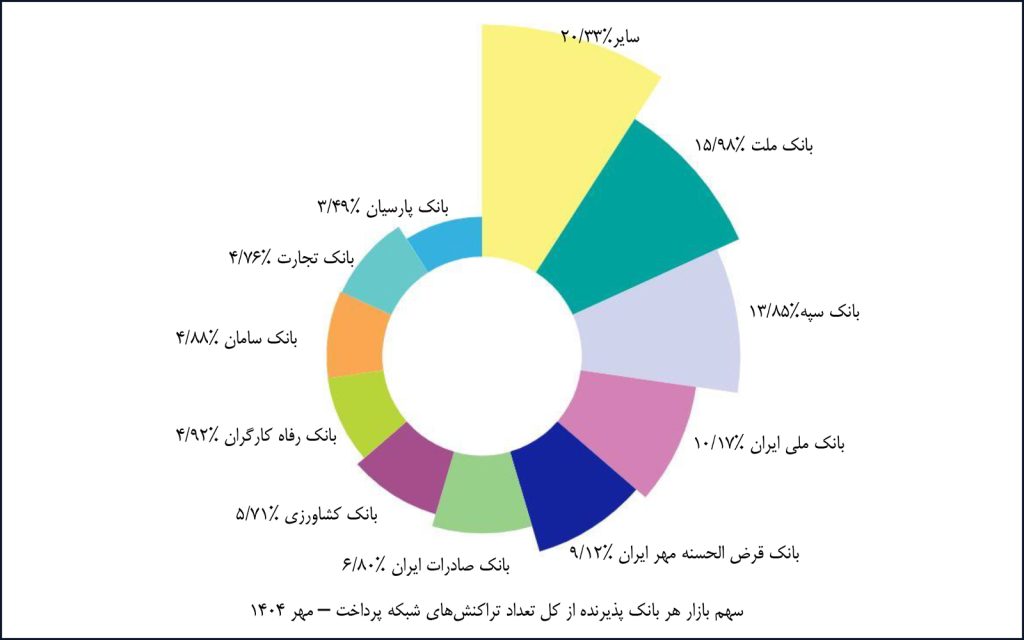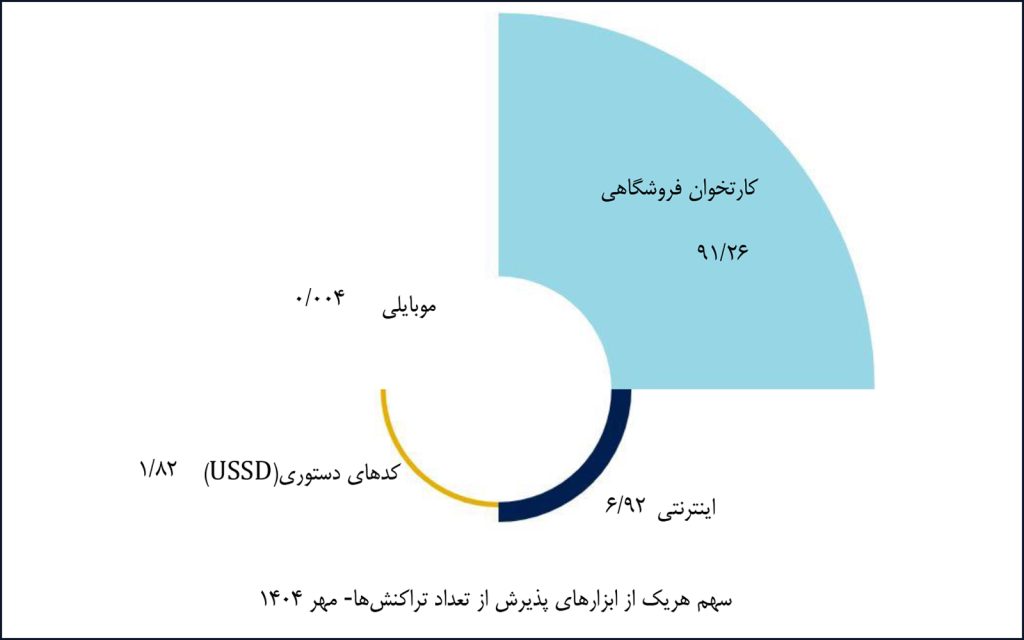 در مهرماه ۱۴۰۴، شرکت «پرداخت الکترونیک سامان» با پوشش ۲۰.۴۱ درصد از بازار تراکنشهای کارتخوان فروشگاهی، همانند ماه گذشته بالاترین سهم را در اختیار دارد. شرکت «به پرداخت ملت» نیز در ابزار پذیرش اینترنتی و کدهای دستوری (USSD) به ترتیب با سهمهای ۳۸.۳۹ و ۴۶.۵۶ درصد بیشترین سهم بازار را به خود اختصاص داده است. همچنین شرکت «پرداخت الکترونیک سداد» با پوشش ۱۰۰ درصد از بازار تراکنشهای موبایلی، بالاترین سهم این ابزار پذیرش را در اختیار دارد.