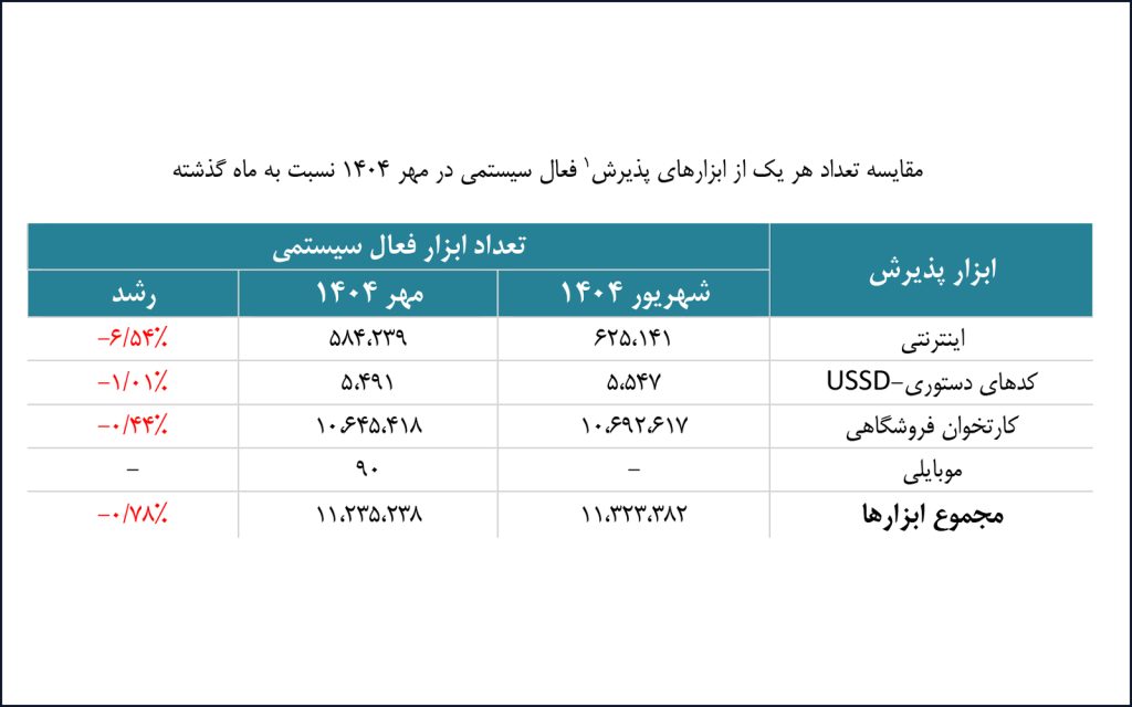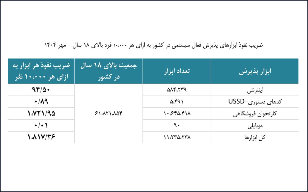 در مهرماه ۱۴۰۴، ضریب نفوذ کل ابزارهای پذیرش فعال در شبکه حدود ۱.۸۱۷.۳۶ ابزار به ازای هر ۱۰ هزار نفر بالای ۱۸ سال در کشور بوده است. بیشترین سهم این ابزارها متعلق به کارتخوانهای فروشگاهی است که حدود ۱.۷۲۱.۹۵ عدد به ازای هر ۱۰ هزار نفر در دسترس است. در مقابل، ابزار پذیرش موبایلی کمترین نفوذ را داشته و تنها ۰.۰۱ ابزار به ازای هر ۱۰ هزار نفر فعال است. ابزار پذیرش کدهای دستوری (USSD) با ۰.۸۹ ابزار و ابزارهای پذیرش اینترنتی با ۹۴.۵۰ عدد به ازای هر ۱۰ هزار نفر در میانه این ردهبندی قرار دارند.
