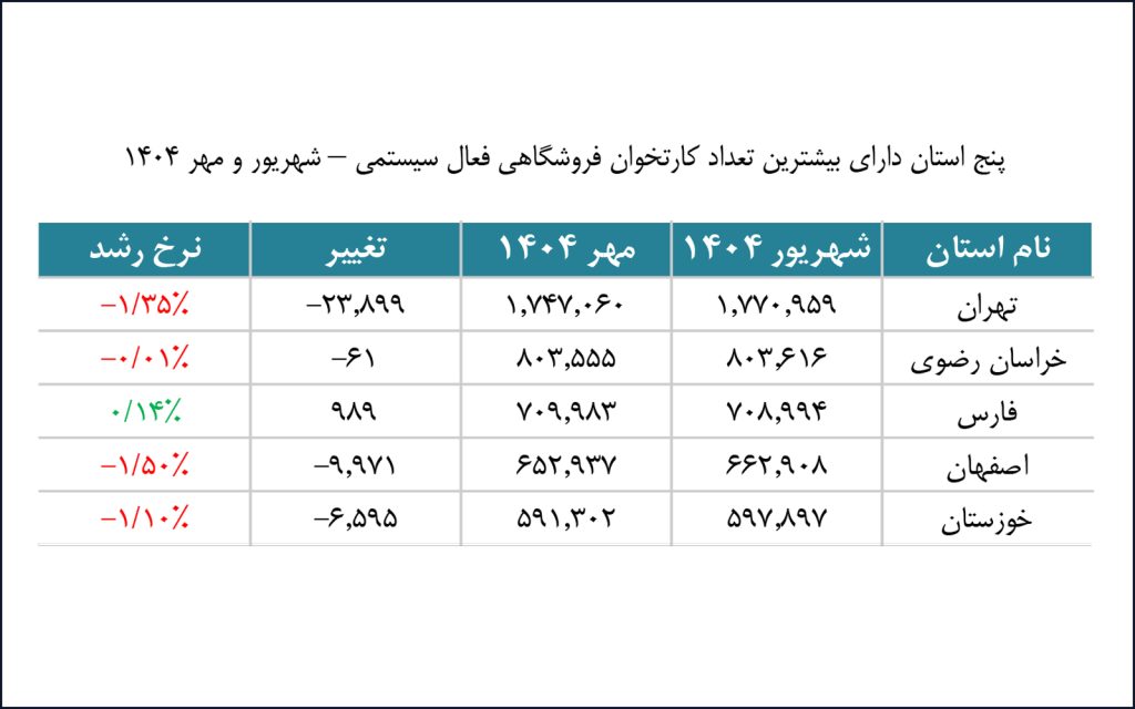 طبق گزارش شاپرک، استانهای تهران، خراسان رضوی، فارس، اصفهان و خوزستان به ترتیب بیشترین تعداد کارتخوان فروشگاهی فعال را در مهرماه ۱۴۰۴ داشتهاند.
