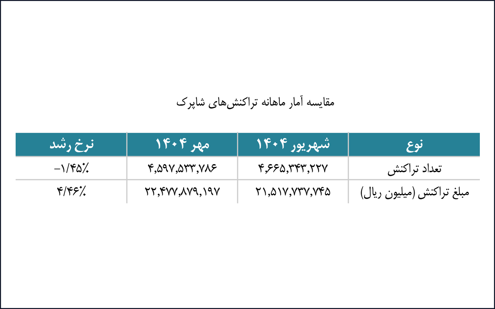 در مهرماه ۱۴۰۴ بیش از ۲۲.۴۷۷ هزار میلیارد ریال تراکنش در شبکه شاپرک پردازش شد که نسبت به شهریورماه کاهش ۱.۴۵ درصدی در تعداد و افزایش ۴.۴۶ درصدی در ارزش ریالی داشته است. در مقایسه با مهرماه ۱۴۰۳، تعداد تراکنشها ۴.۴۸ درصد و ارزش ریالی آنها ۵۸.۱۶ درصد رشد یافته است. در این ماه، شرکتهای «پرداخت الکترونیک سامان» و «به پرداخت ملت» به ترتیب در سهم تعدادی و مبلغی تراکنشها پیشتاز بودهاند و بانک ملت همچنان بالاترین سهم پذیرش تراکنشهای بازار را به خود اختصاص داده است.
