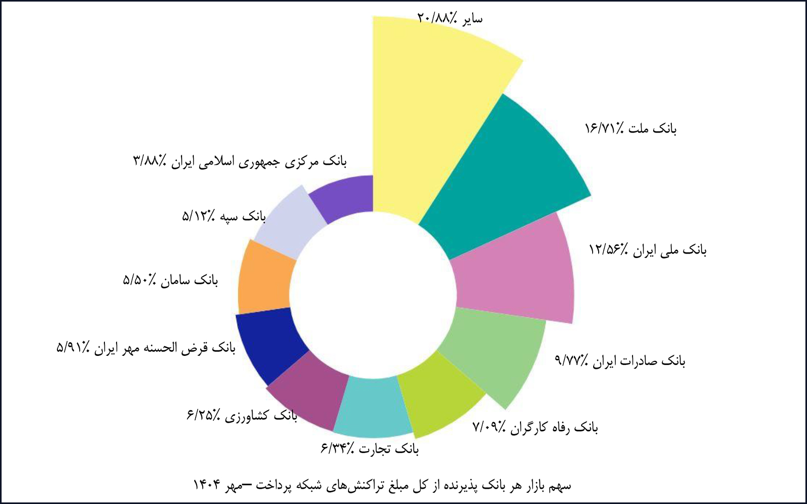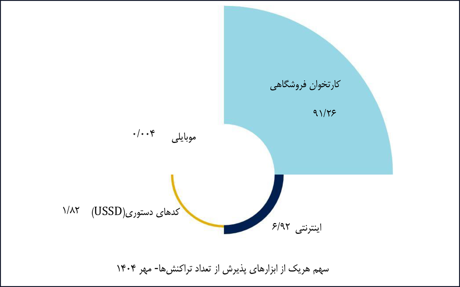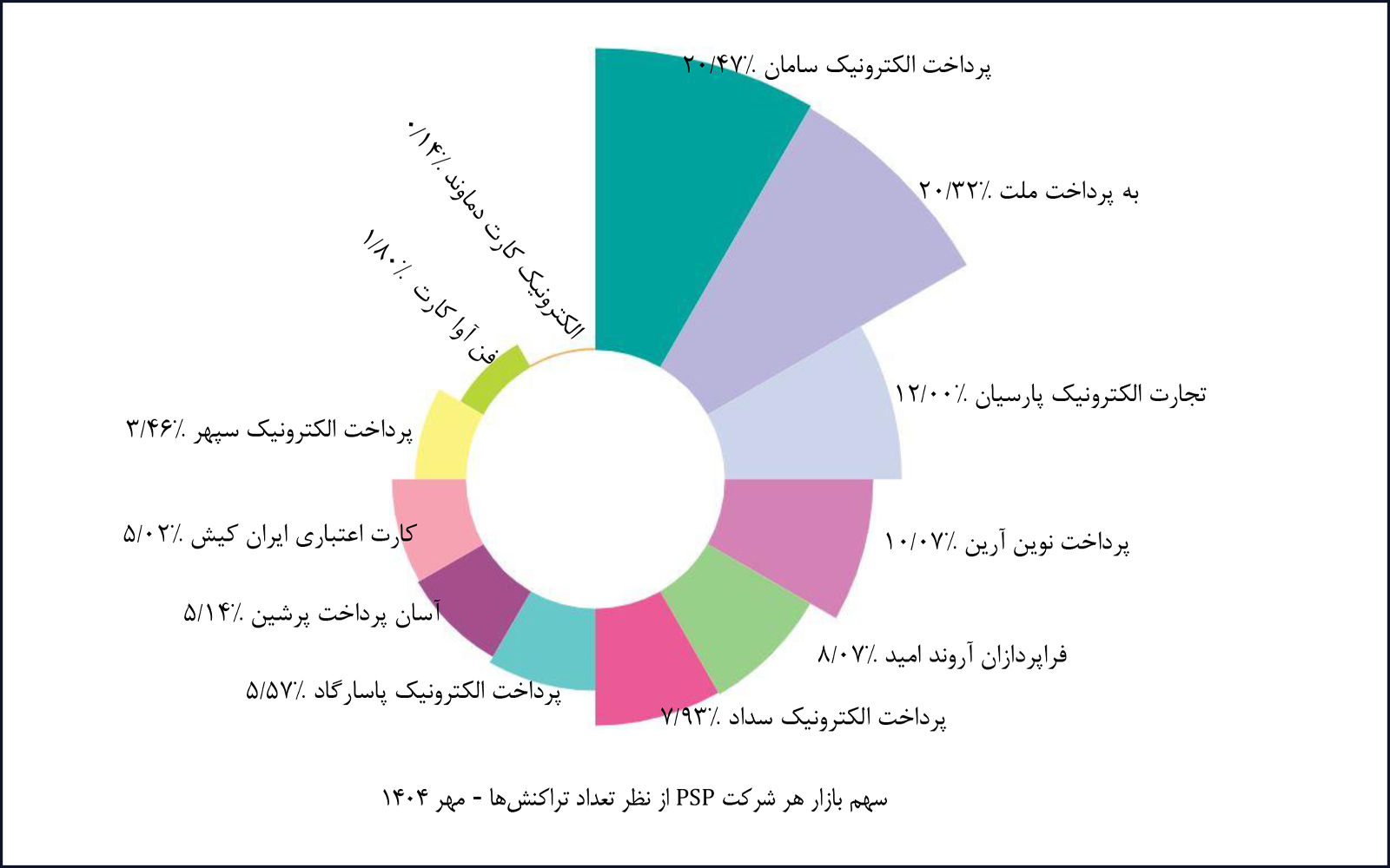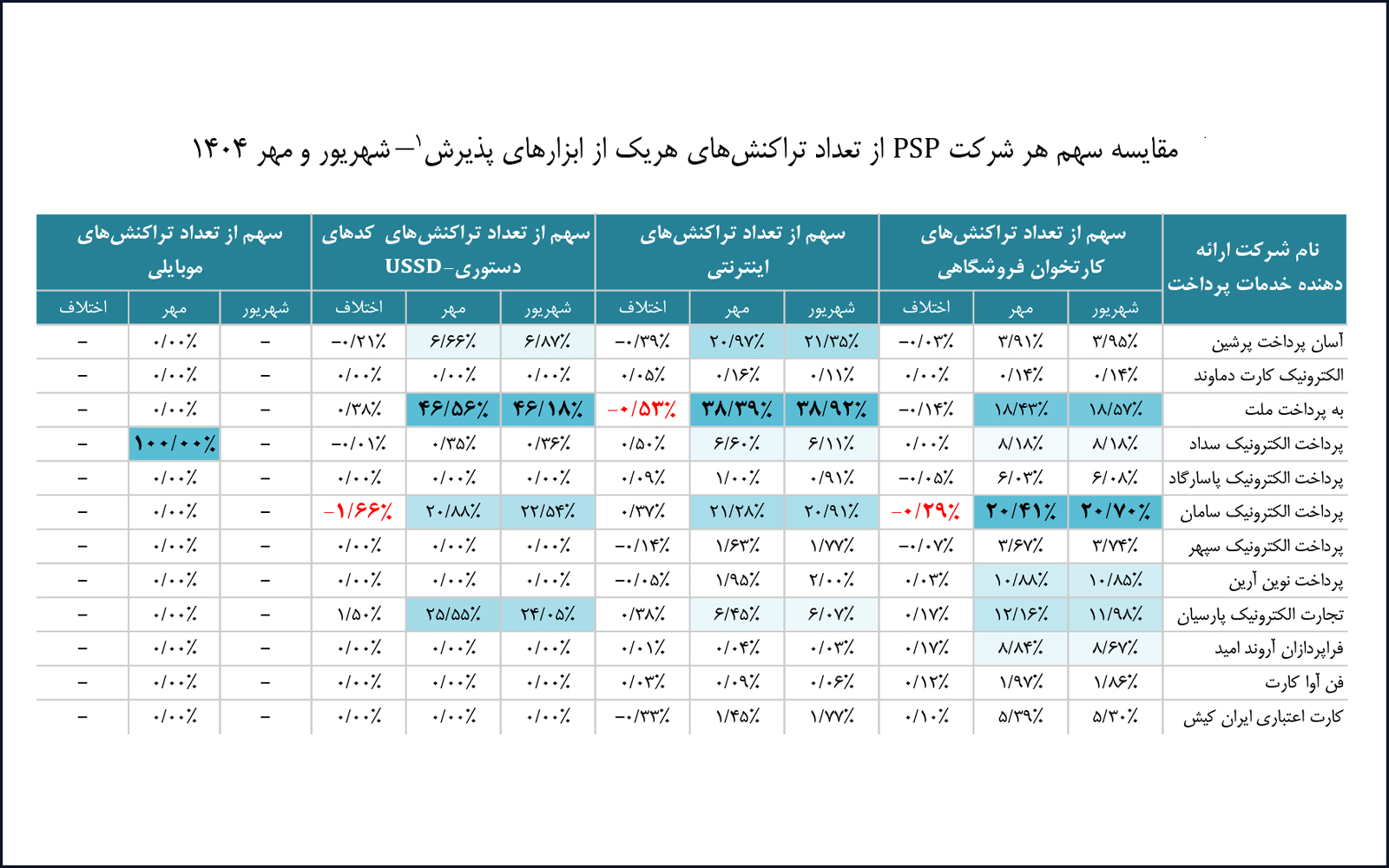 در مهرماه ۱۴۰۴، شرکت «پرداخت الکترونیک سامان» با پوشش ۲۰.۴۱ درصد از بازار تراکنشهای کارتخوان فروشگاهی، همانند ماه گذشته بالاترین سهم را در اختیار دارد. شرکت «به پرداخت ملت» نیز در ابزار پذیرش اینترنتی و کدهای دستوری (USSD) به ترتیب با سهمهای ۳۸.۳۹ و ۴۶.۵۶ درصد بیشترین سهم بازار را به خود اختصاص داده است. همچنین شرکت «پرداخت الکترونیک سداد» با پوشش ۱۰۰ درصد از بازار تراکنشهای موبایلی، بالاترین سهم این ابزار پذیرش را در اختیار دارد.