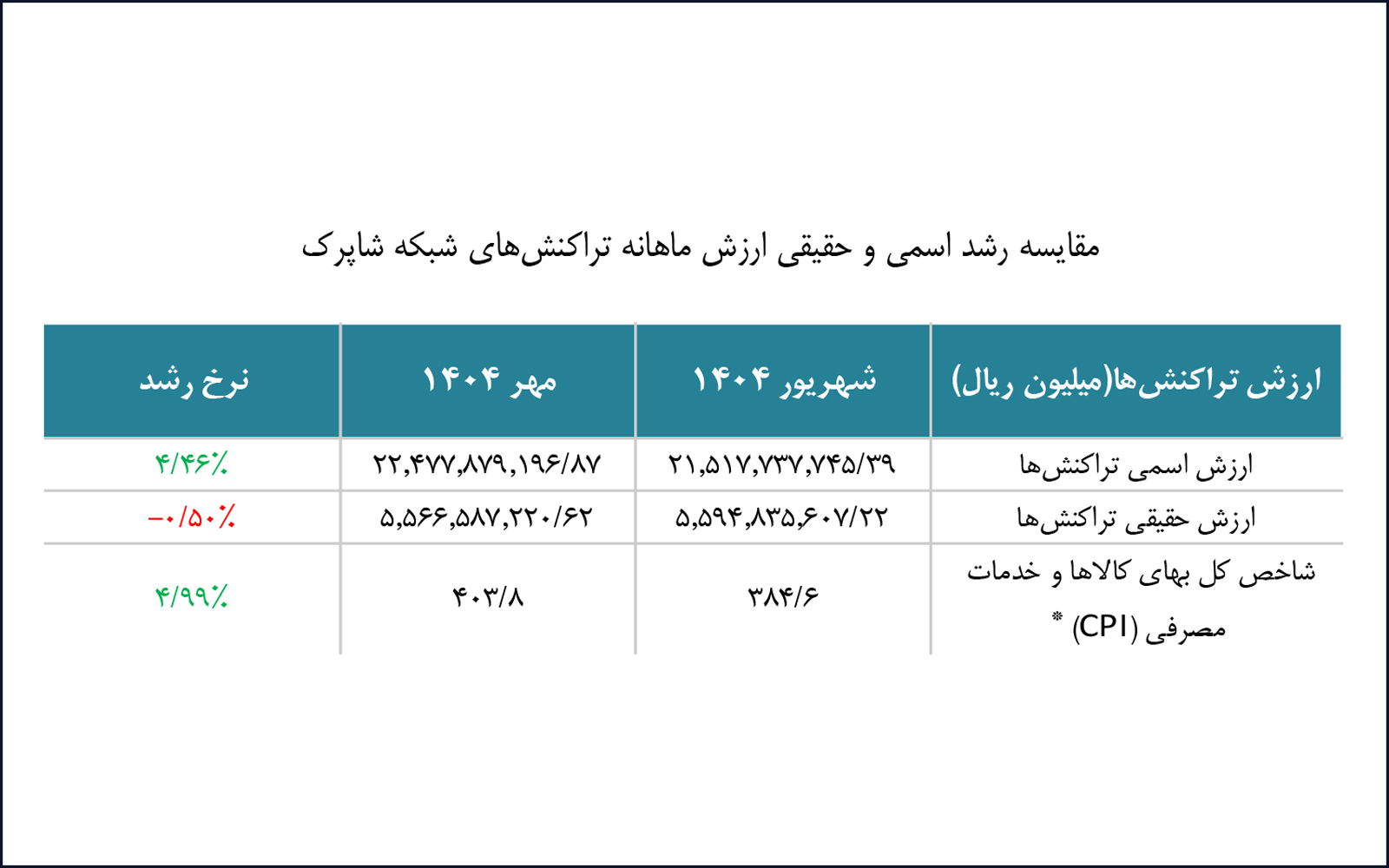 همچنین ارزش اسمی تراکنشهای مهرماه ۱۴۰۴ نسبت به ماه گذشته با رشد ۴.۴۶ درصدی همراه بوده است، این در حالی است که ارزش حقیقی تراکنشها کاهش ۰.۵۰ درصدی را تجربه کرده است. ارزش حقیقی تراکنشها در واقع ارزش تراکنشهای شاپرکی بدون در نظر گرفتن اثرات تورم است.