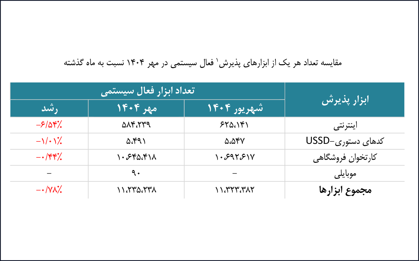 بیشترین اختلاف بین سهم تعدادی تراکنشهای ابزار پذیرش کارتخوان فروشگاهی با کاهش ۰.۲۹ درصد به شرکت «پرداخت الکترونیک سامان» تعلق دارد. در ابزار پذیرش اینترنتی، بیشترین اختلاف سهم با کاهش ۰.۵۳ درصد مربوط به شرکت «به پرداخت ملت» است و در ابزار پذیرش کدهای دستوری (USSD) شرکت «پرداخت الکترونیک سامان» با کاهش ۱.۶۶ درصد، بیشترین اختلاف سهم را در بین شرکتها دارد.