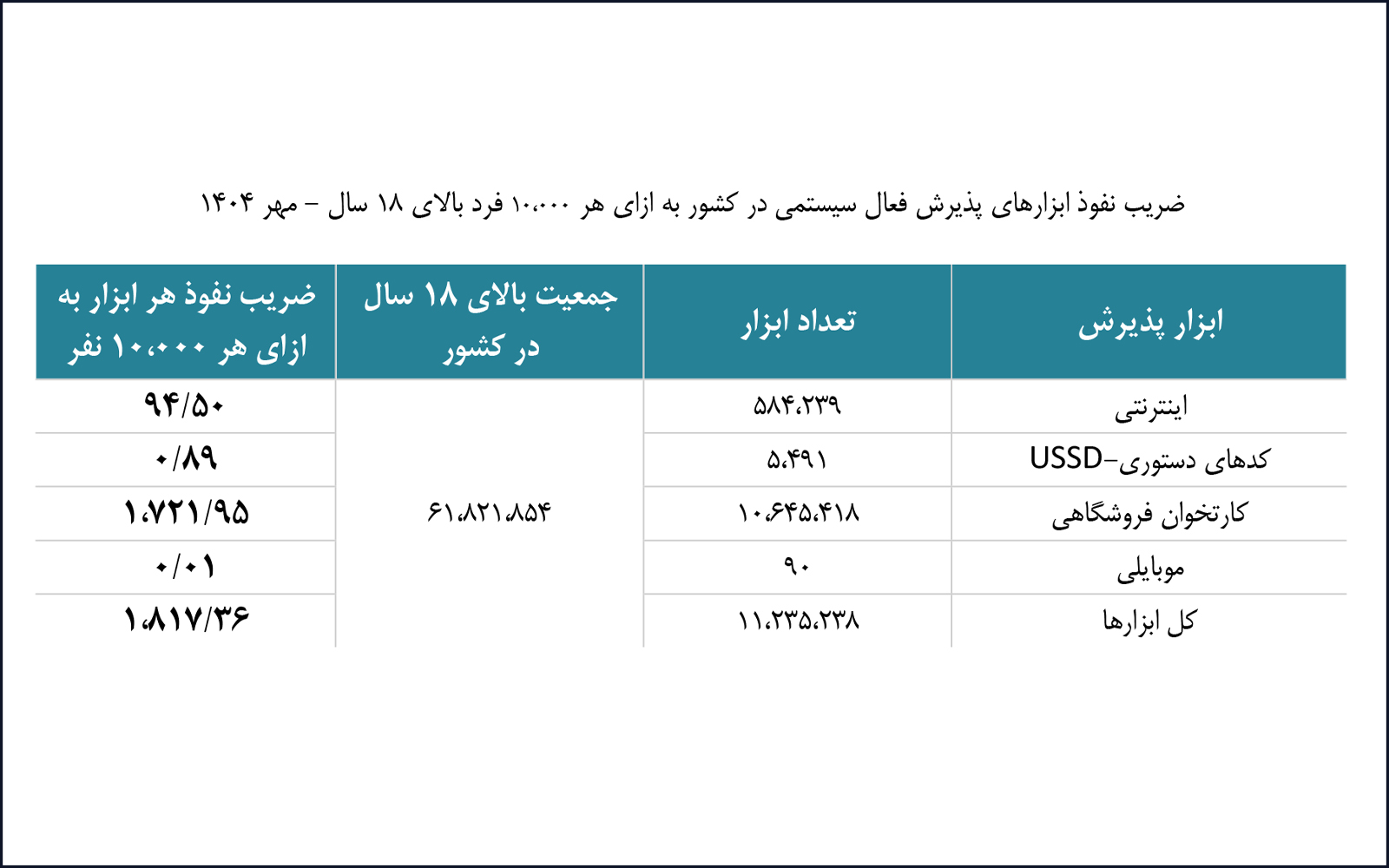 در مهرماه ۱۴۰۴، ضریب نفوذ کل ابزارهای پذیرش فعال در شبکه حدود ۱.۸۱۷.۳۶ ابزار به ازای هر ۱۰ هزار نفر بالای ۱۸ سال در کشور بوده است. بیشترین سهم این ابزارها متعلق به کارتخوانهای فروشگاهی است که حدود ۱.۷۲۱.۹۵ عدد به ازای هر ۱۰ هزار نفر در دسترس است. در مقابل، ابزار پذیرش موبایلی کمترین نفوذ را داشته و تنها ۰.۰۱ ابزار به ازای هر ۱۰ هزار نفر فعال است. ابزار پذیرش کدهای دستوری (USSD) با ۰.۸۹ ابزار و ابزارهای پذیرش اینترنتی با ۹۴.۵۰ عدد به ازای هر ۱۰ هزار نفر در میانه این ردهبندی قرار دارند.