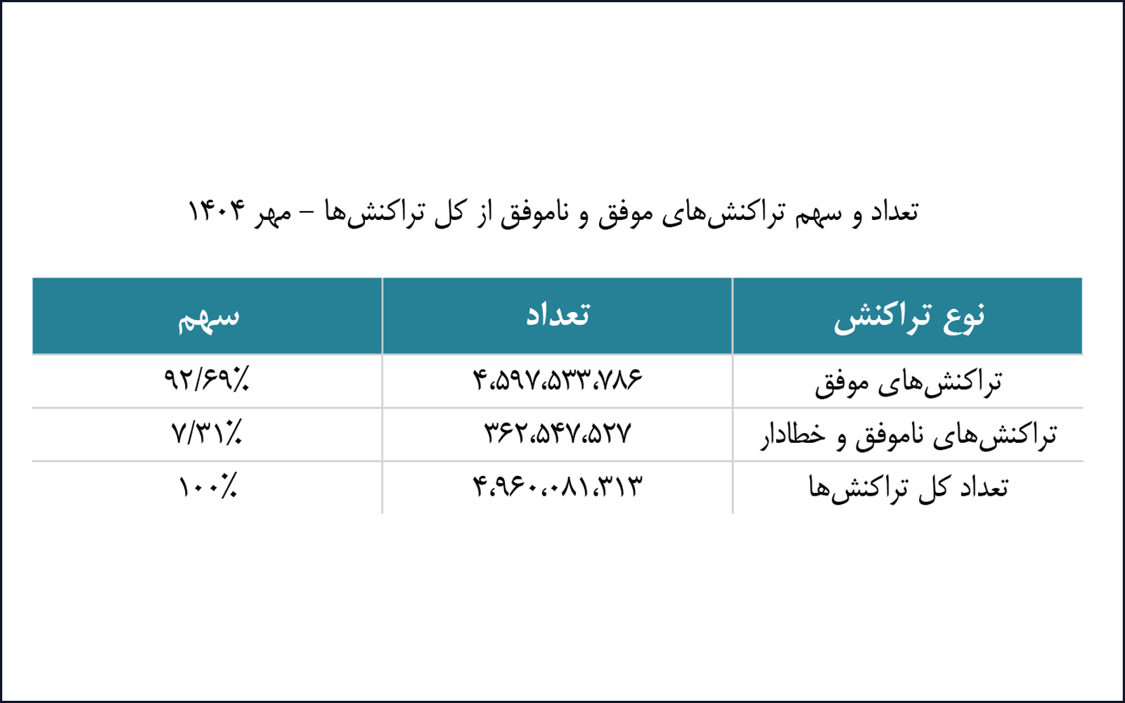 بررسی اطلاعات مربوط به تعداد تراکنشهای موفق و ناموفق (خطادار) کل شبکه شاپرک در مهرماه ۱۴۰۴ نشان میدهد که ۹۲.۶۹ درصد از تراکنشها موفق و ۷.۳۱ درصد از آنها ناموفق بودهاند.