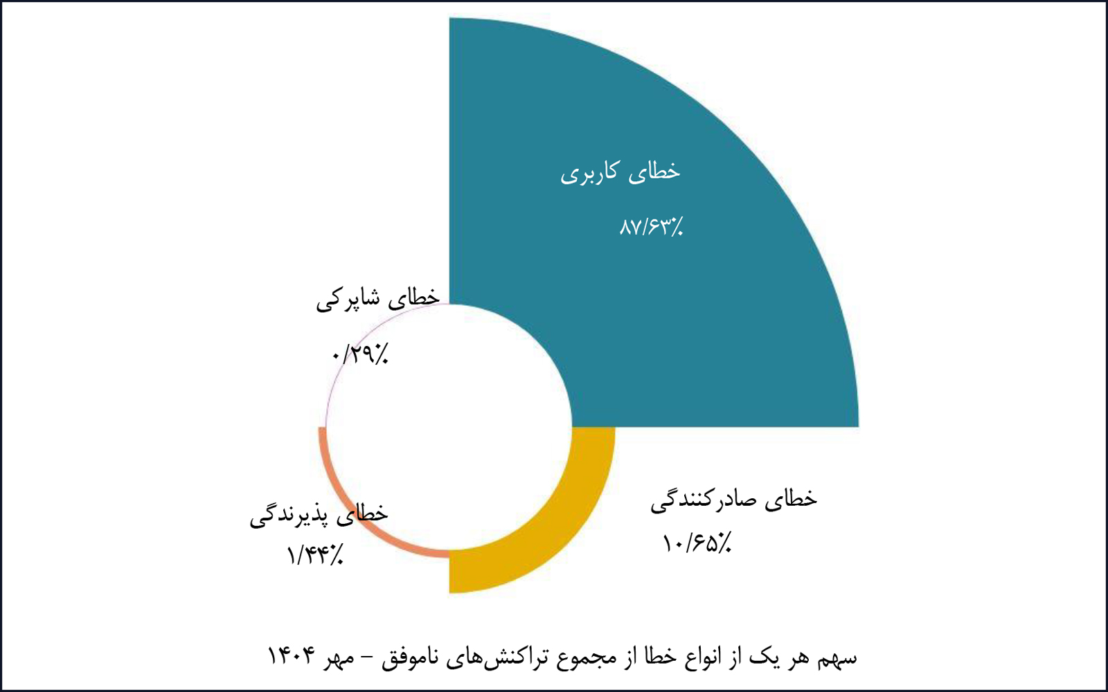 بررسی خطاهای تراکنشها در مهرماه ۱۴۰۴ نشان میدهد که خطای کاربری با سهم ۸۷.۶۳ درصد، عمدهترین عامل بروز خطاها بوده است. این نوع خطاها ناشی از عملکرد دارنده کارت مانند کمبود موجودی یا فراموشی رمز بوده و ارتباطی به عملکرد شبکه پرداخت الکترونیک ندارد. همچنین، خطای صادرکنندگی ۱۰.۶۵ درصد، خطای پذیرندگی ۱.۴۴ درصد و خطای شاپرکی ۰.۲۹ درصد از کل خطاها را تشکیل میدهند.