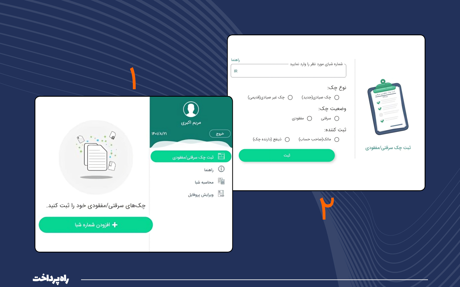 • شماره شبا، نوع چک و وضعیت (مفقودی یا سرقتی) را وارد کند.
