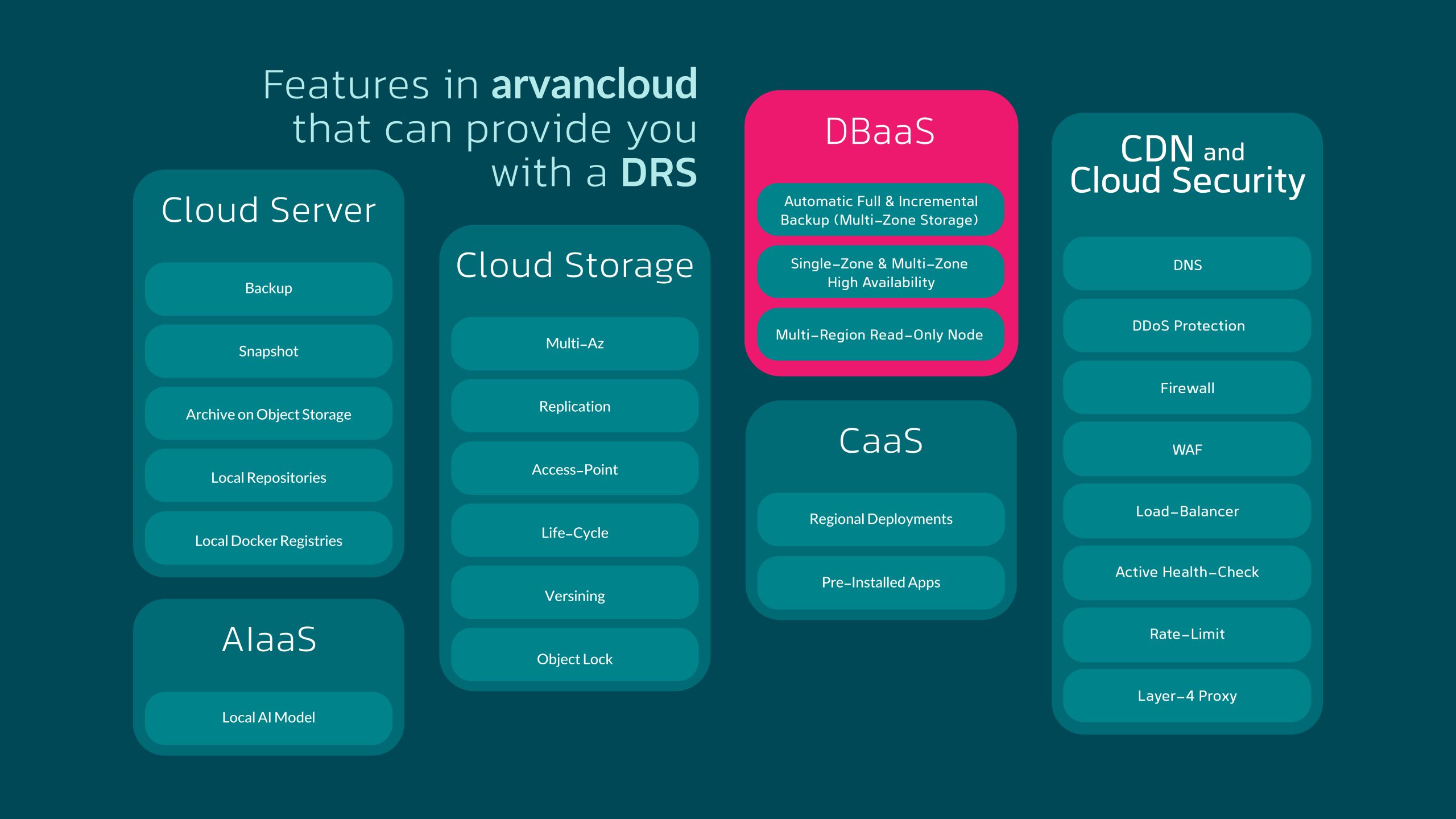 این ویژگی دیتابیس مدیریت‌شده‌ ابری آروان‌کلاد در راهکار DRaaS با فرایندی که شبیه نجاتِ داده‌هاست، در محل جغرافیایی متفاوت و حتی زیرساخت متفاوت از دیتابیس اصلی کار می‌کند؛ به این معنا این ویژگی باعث می‌شود تا میزان آسیب حادثه‌های غیرمنتظره یا خطاهای انسانی به کم‌ترین میزان برسد و زنجیره‌ ارتباطی کسب‌وکار با کاربرهایش قطع نشود. هم‌چنین این ویژگی از آن نظر استراتژیک است که به مشتریانی که شناخت خوبی نسبت به زیرساخت ابری ندارند، کمک می‌کند به‌شکل مرحله‌به‌مرحله به این زیرساخت مهاجرت کنند.