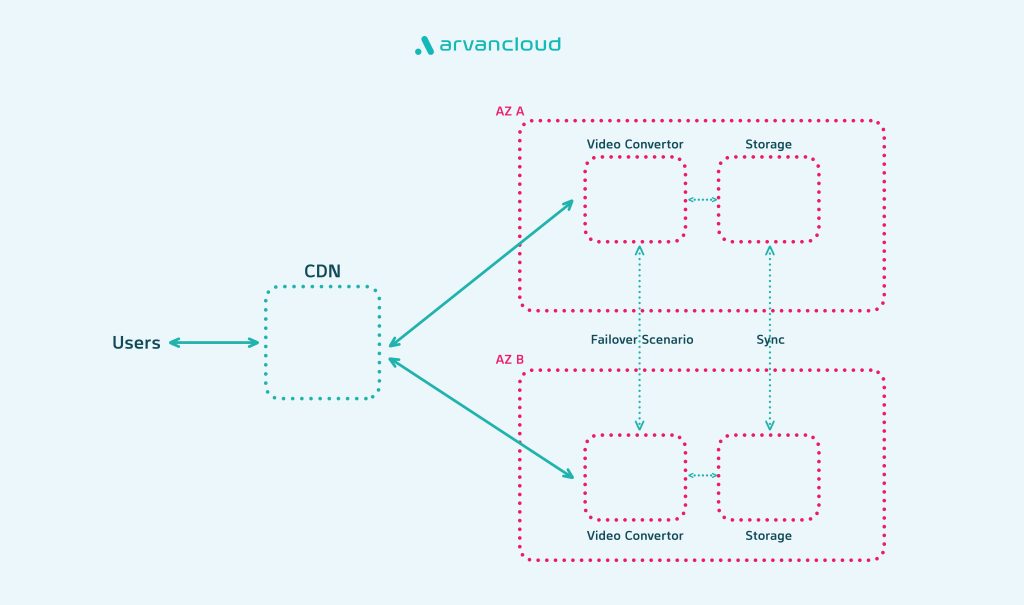 2. زیرساخت نگهداری و کانورت مالتی‌ زون: بعد از بارگذاری هر ویدئو در پلتفرم ویدئوی آروان‌کلاد، ویدئوی اولیه به‌طور خودکار به نسخه‌های مختلفی تبدیل می‌شود و این به‌دلیل ویژگی  ABR پخش تطبیقی یا Adabtive Bitrate است تا مخاطبان بسته به پهنای باند و نیاز خود نسخه‌های مختلفی از هر ویدئو تماشا کنند. فرآیند کانورت به کیفیت‌های مختلف در دو دیتاسنتر با کلاسترهای GPU مجزا انجام می‌شود. کلاسترهای مالتی زون باعث می‌شود تا پس از وقوع مشکلات احتمالی برای یک دیتاسنتر، در دیتاسنتر دوم داده‌ها بدون هیچ خطر و تغییری در دسترس باشند.