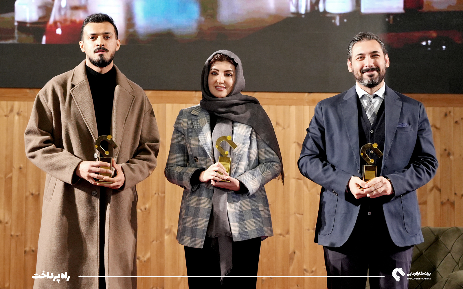 تندیس سومین دوره رویداد برند کارفرمایی به عسل آغاز، رضا غیابی و آسیه حاتمی اهدا شد