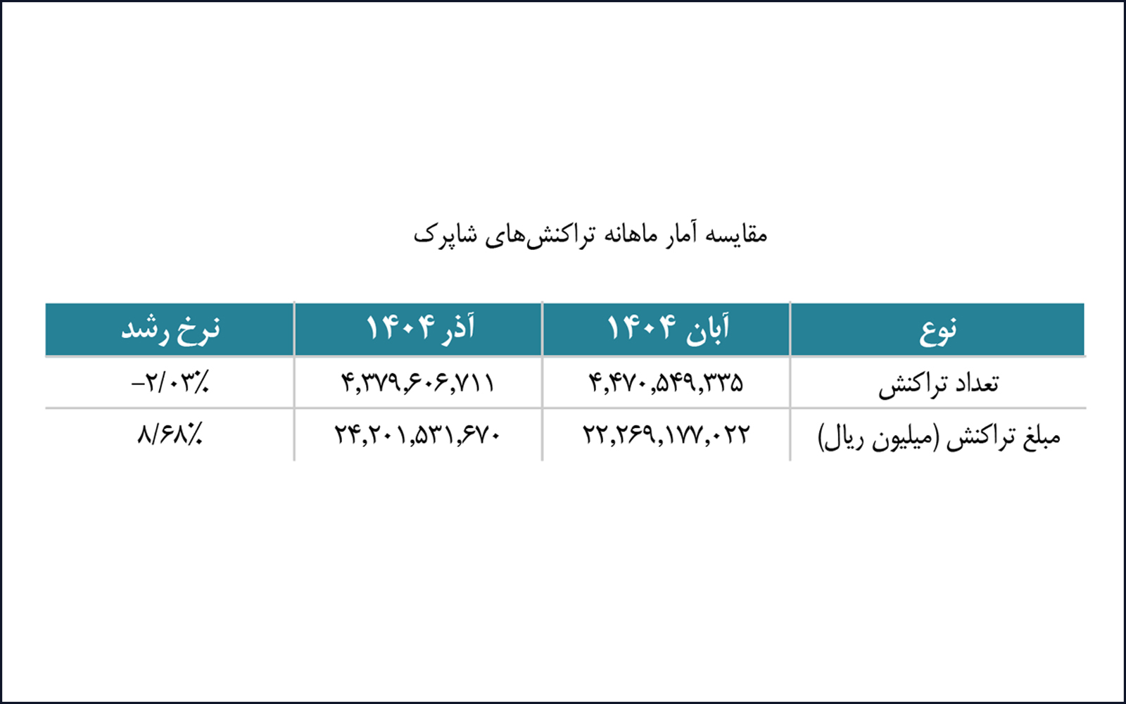 بر اساس صد و بیستوششمین گزارش اقتصادی شاپرک، در آذر ماه ۱۴۰۴، شبکه پرداخت الکترونیکی کشور بالغ بر ۴.۳۷۹ میلیون تراکنش را پردازش کرده که این میزان تراکنش، گردش مالی بیش از ۲.۴۲۰ همت را در پی داشته است. این آمار نسبت به آبانماه نشاندهنده کاهش ۲.۰۳ درصدی در تعداد تراکنشها و در مقابل رشد ۸.۶۸ درصدی در مبلغ تراکنشها است. این ارقام بیانگر نقش محوری و روزافزون شاپرک در تسهیل مبادلات اقتصادی و کاهش اتکای اقتصاد به پول نقد است.