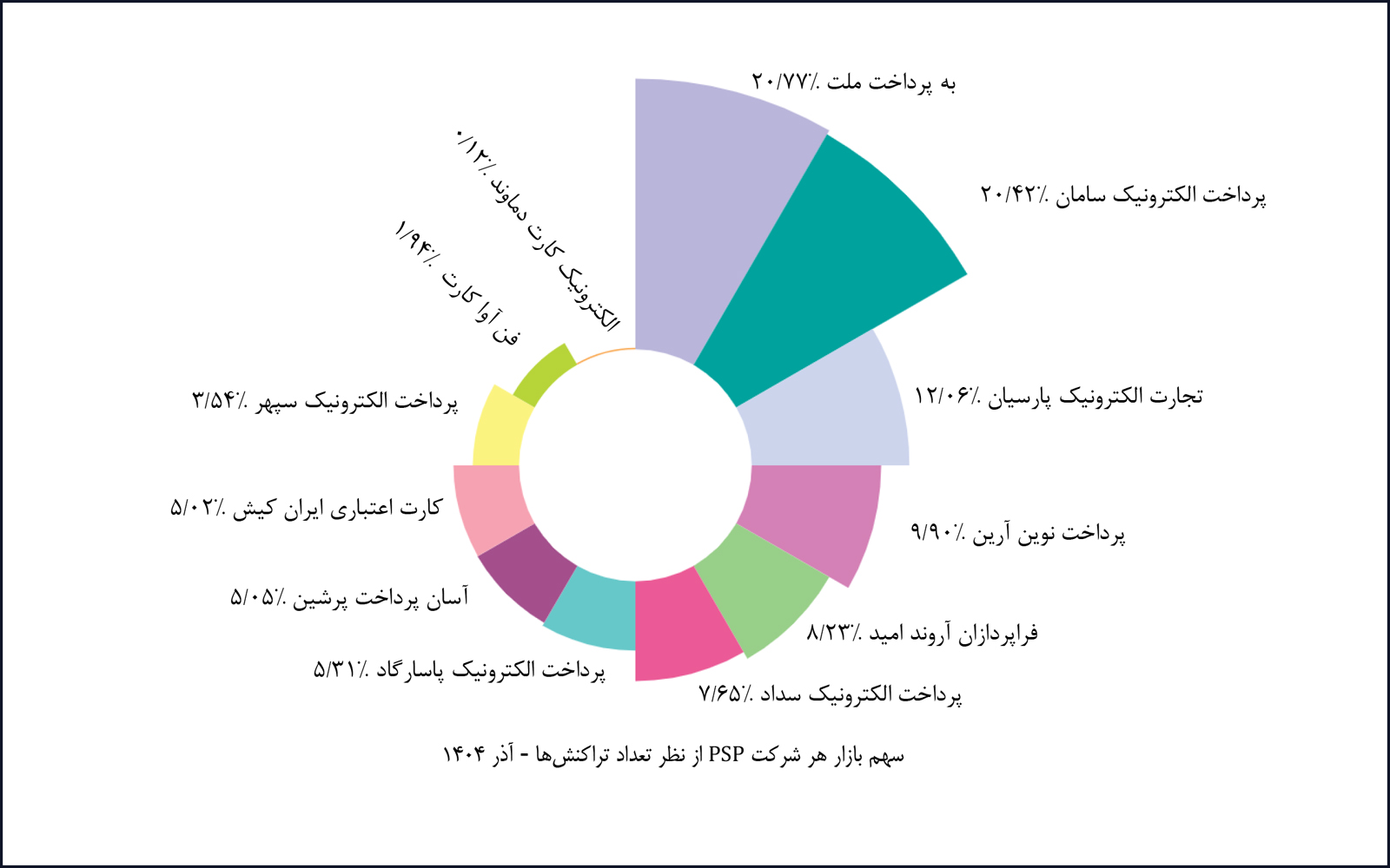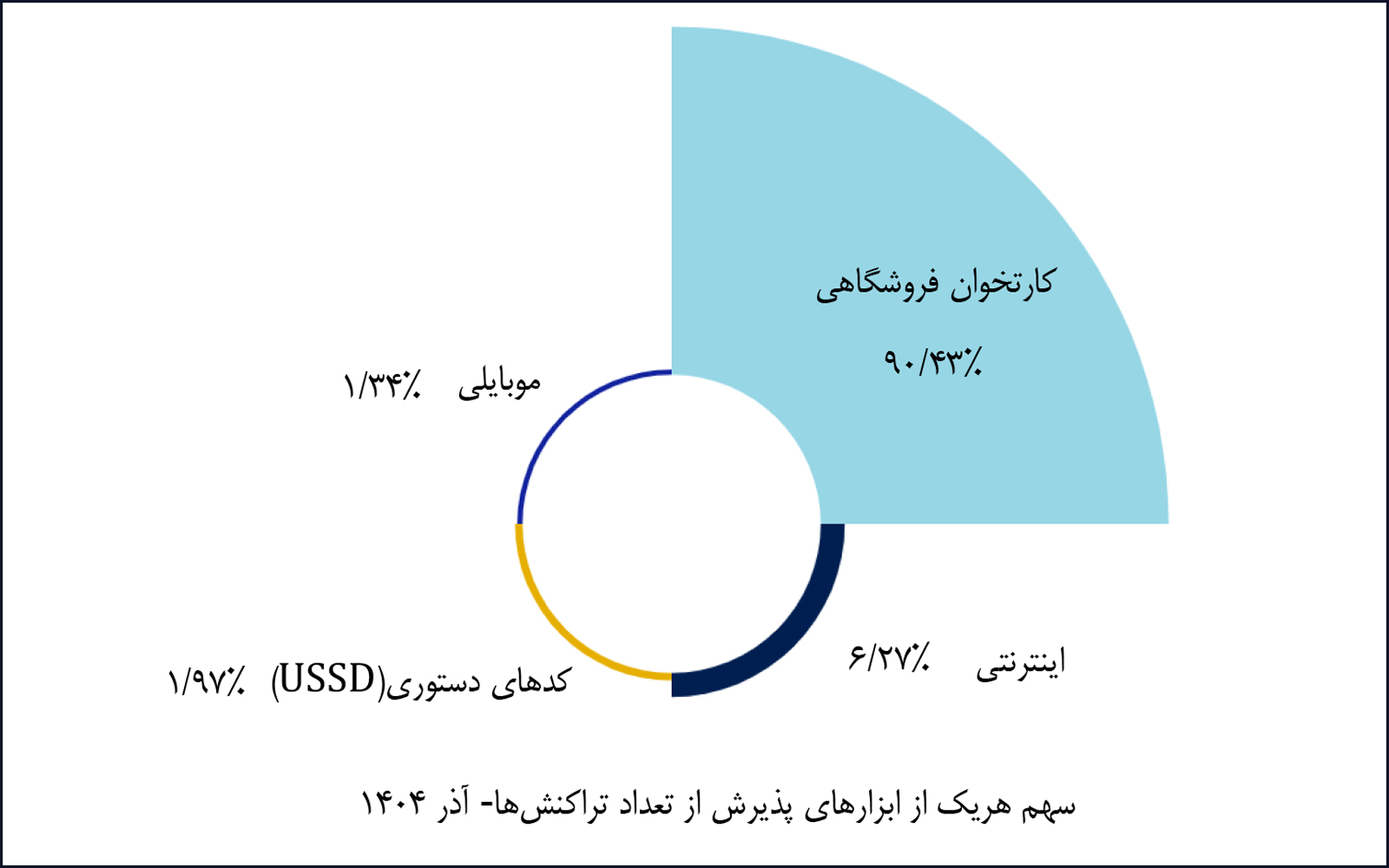 در آذرماه ۱۴۰۴، شرکت پرداخت الکترونیک سامان با پوشش ۲۰.۲۵ درصد از بازار تعداد تراکنشهای کارتخوان فروشگاهی، همانند ماه گذشته بالاترین سهم این ابزار پذیرش را در اختیار داشته است. همچنین شرکت به پرداخت ملت در هر دو ابزار پذیرش اینترنتی و کدهای دستوری (USSD) بهترتیب با سهمهای ۴۵.۷۶ درصد و ۴۶.۱۱ درصد، بیشترین سهم بازار را به خود اختصاص داده است. در ابزار پذیرش موبایلی نیز شرکت آسان پرداخت پرشین با پوشش ۹۸.۴۷ درصد از بازار تعداد تراکنشها، بالاترین سهم را در اختیار دارد.