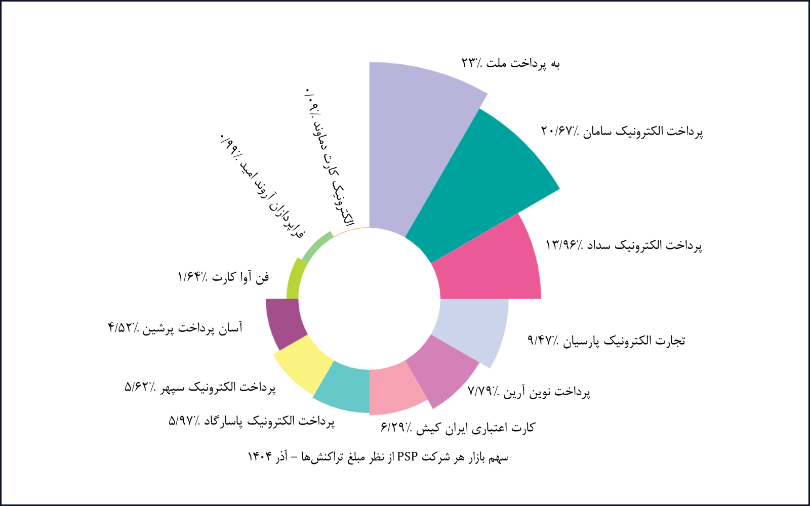 در شاخص سهم تعدادی و سهم مبلغی تراکنشها، شرکت به پرداخت ملت در آذرماه ۱۴۰۴ به ترتیب با سهم ۲۰.۷۷ درصد و ۲۳.۰۰ درصد، جایگاه نخست بازار را به خود اختصاص داده است. در این ماه، اختلاف سهم تعدادی و مبلغی شرکت پرداخت الکترونیک سامان (دومین شرکت بازار) با شرکت به پرداخت ملت بهترتیب ۰.۳۵ درصد و ۲.۳۳ درصد گزارش شده است.