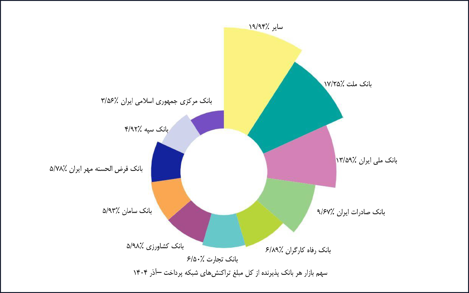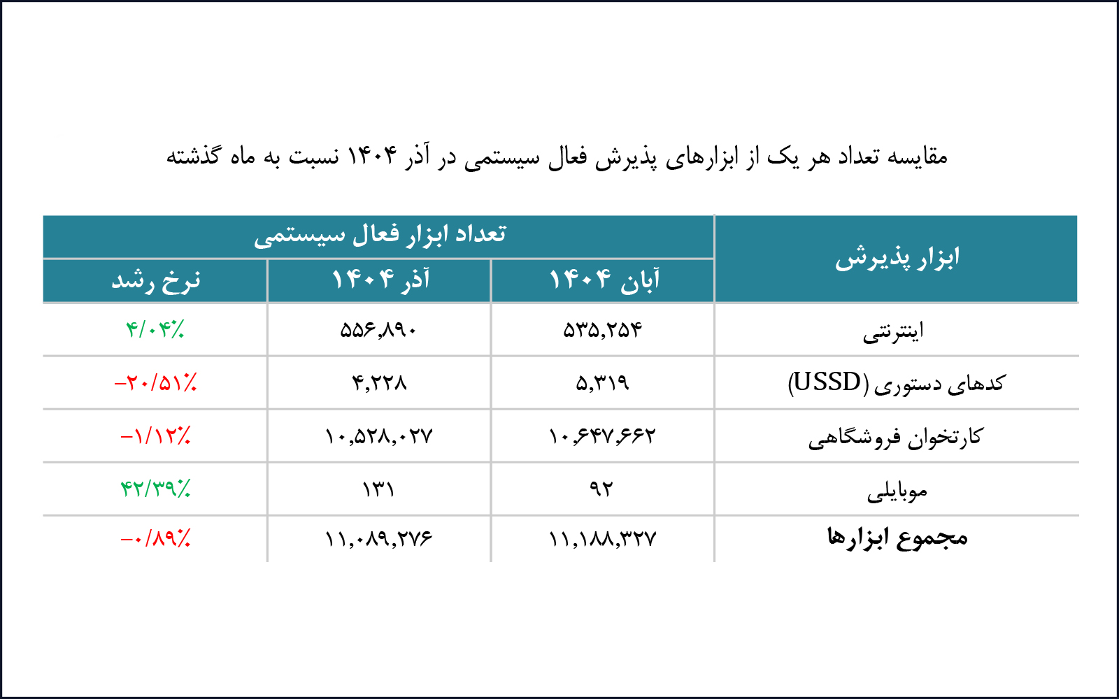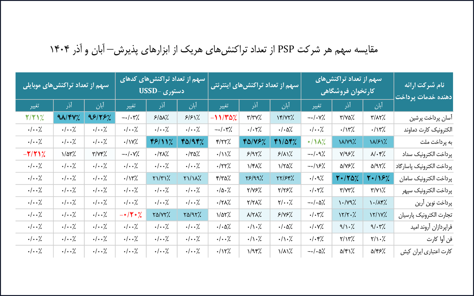 مقایسه این شاخصها با گزارش آبانماه ۱۴۰۴ نشان میدهد که در مؤلفه سهم تعدادی تراکنشها، شرکت آسان پرداخت پرشین با یک پله صعود در جایگاه هشتم قرار گرفته و شرکت کارت اعتباری ایرانکیش با یک پله نزول به جایگاه نهم رسیده است.
