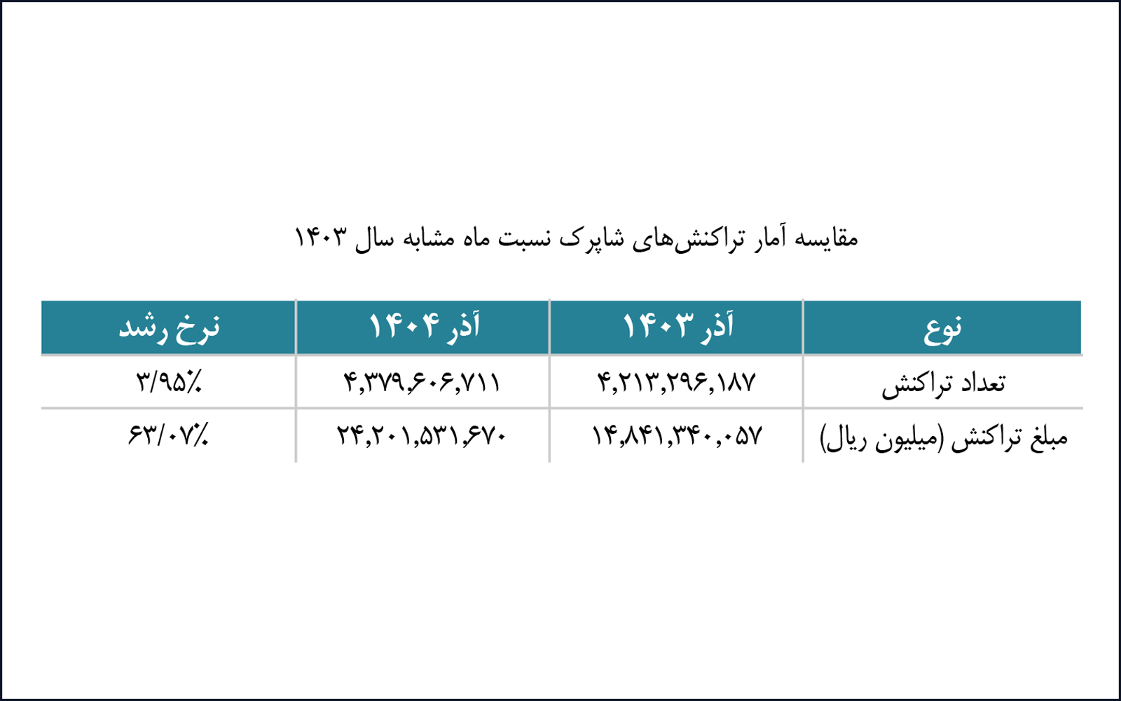 بر اساس این گزارش، تعداد تراکنشهای آذرماه ۱۴۰۴ نسبت به ماه مشابه سال ۱۴۰۳ از نظر تعدادی ۳.۹۵ درصد رشد داشته و از نظر مبلغ تراکنش نیز افزایشی معادل ۶۳.۰۷ درصد را تجربه کرده است.