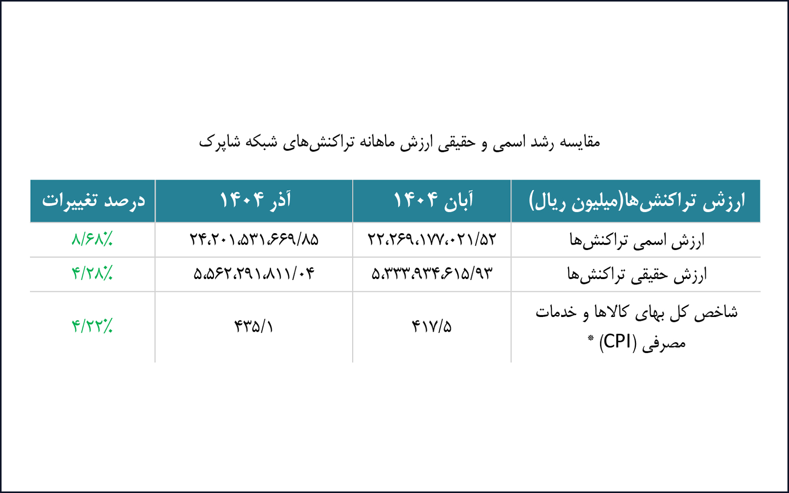 همچنین ارزش اسمی تراکنشهای آذرماه ۱۴۰۴ نسبت به ماه گذشته با رشد ۸.۶۸ درصدی همراه بوده است. این در حالی است که ارزش حقیقی تراکنشها نیز رشد ۴.۲۸ درصدی را تجربه کرده است. ارزش حقیقی تراکنشها در واقع بیانگر ارزش تراکنشهای شاپرکی بدون در نظر گرفتن اثرات تورم است.