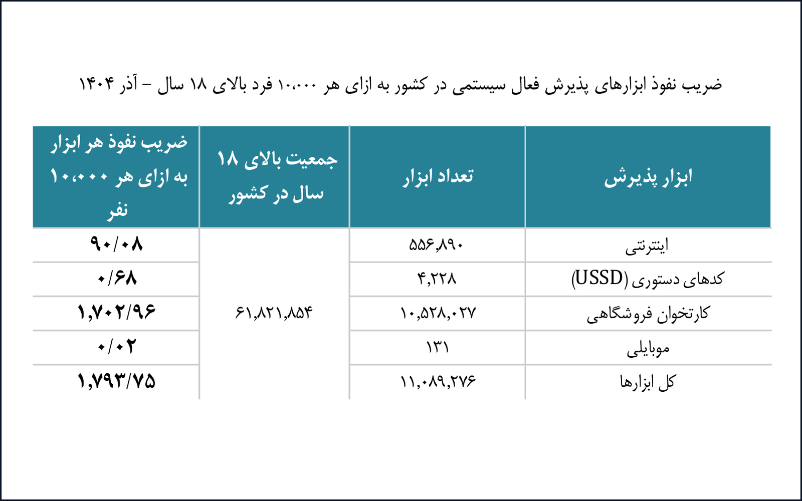 در آذرماه ۱۴۰۴، ضریب نفوذ مجموع ابزارهای پذیرش فعال سیستمی در کشور حدود ۱.۷۹۳.۷۵ ابزار به ازای هر ۱۰ هزار نفر بالای ۱۸ سال بوده است. بیشترین سهم از این ابزارها به کارتخوانهای فروشگاهی اختصاص داشته که با حدود ۱.۷۰۲.۹۶ ابزار به ازای هر ۱۰ هزار نفر، بالاترین میزان نفوذ را به خود اختصاص دادهاند. در مقابل، ابزار پذیرش موبایلی کمترین میزان نفوذ را داشته و تنها ۰.۰۲ ابزار به ازای هر ۱۰ هزار نفر در کشور فعال بوده است. همچنین، ابزارهای پذیرش اینترنتی با حدود ۹۰.۰۸ ابزار به ازای هر ۱۰ هزار نفر بالای ۱۸ سال، در سطح میانی این ردهبندی قرار دارند.