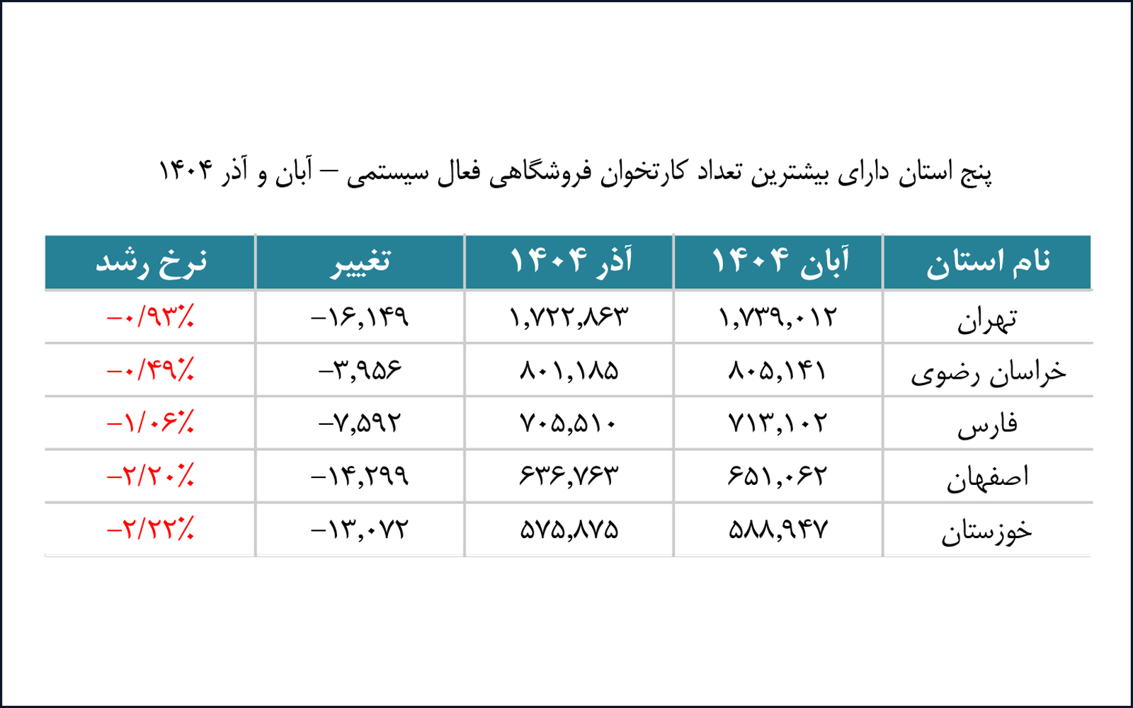 طبق گزارش شاپرک، استانهای تهران، خراسان رضوی، فارس، اصفهان و خوزستان بهترتیب بیشترین تعداد کارتخوان فروشگاهی فعال را در آذرماه ۱۴۰۴ به خود اختصاص دادهاند.