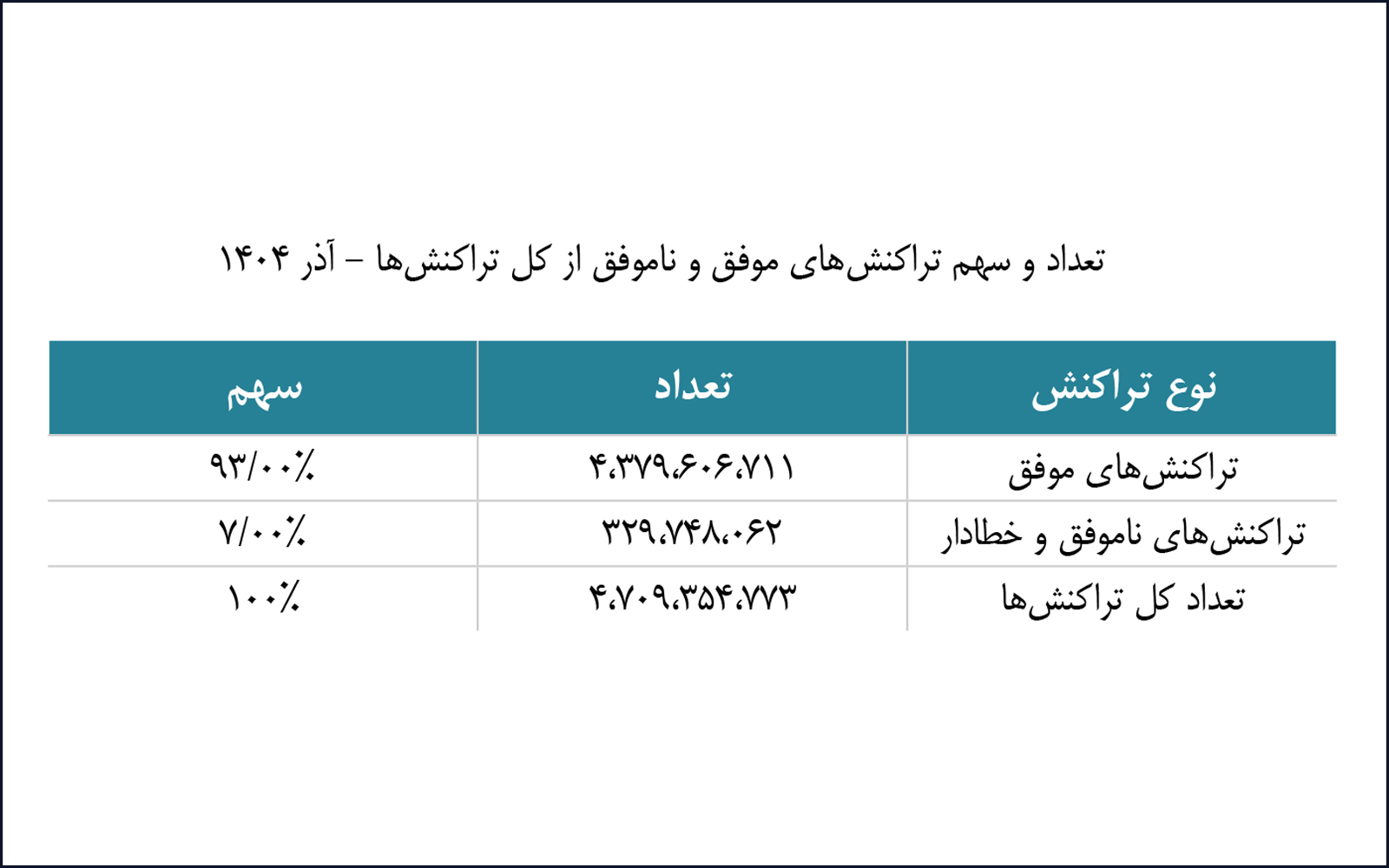بررسی اطلاعات مربوط به تعداد تراکنشهای موفق و ناموفق (خطادار) در کل شبکه شاپرک در آذرماه ۱۴۰۴ نشان میدهد که ۹۳.۰۰ درصد از تراکنشها موفق بوده و ۷.۰۰ درصد از آنها ناموفق (خطادار) بودهاند.