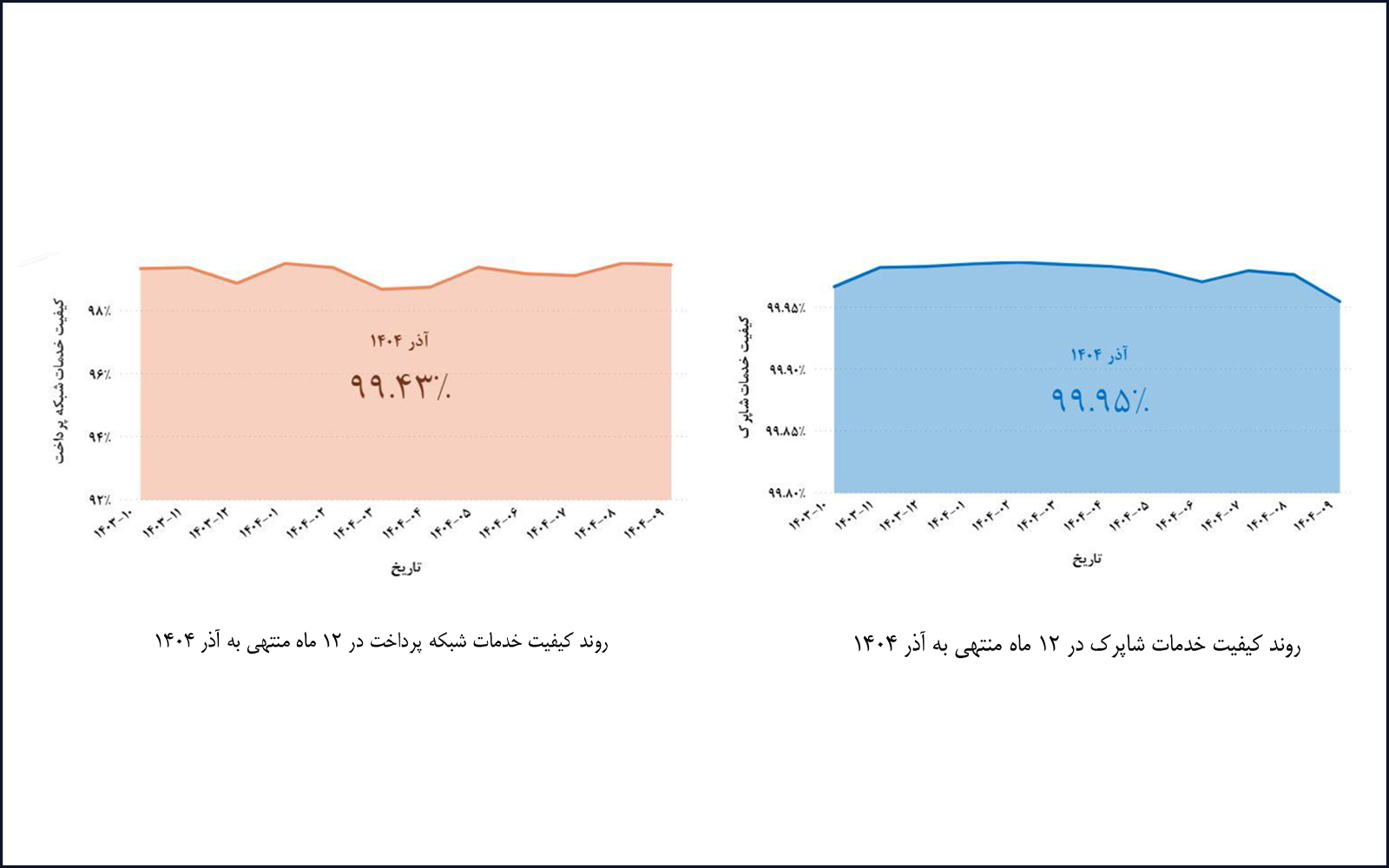 در این گزارش همچنین شاخص کیفیت خدمات شاپرک و شبکه پرداخت به ترتیب ۹۹.۹۵ و ۹۹.۴۳ درصد اعلام شده که نشاندهنده پایداری بالا، آمادگی عملیاتی شبکه و اعتماد عمومی به زیرساختهای پرداخت الکترونیکی کشور است. استمرار این سطح از کیفیت، حاصل نظارت مستمر، توسعه زیرساختها و ارتقای استانداردهای فنی در شبکه شاپرک عنوان شده است.