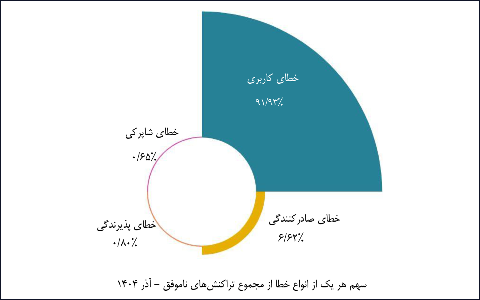 بررسی خطاهای تراکنشها در آذرماه ۱۴۰۴ نشان میدهد که خطای کاربری با سهم ۹۱.۹۳ درصدی، مهمترین عامل بروز خطاها در شبکه پرداخت بوده است. این نوع خطاها به عملکرد دارنده کارت، مانند کمبود موجودی یا فراموشی رمز مربوط میشود و ارتباطی با عملکرد شبکه پرداخت الکترونیک ندارد. در ادامه، خطای صادرکنندگی با ۶.۶۲ درصد، خطای پذیرندگی با ۰.۸۰ درصد و خطای شاپرکی با ۰.۶۵ درصد از کل خطاهای ثبتشده را به خود اختصاص دادهاند.